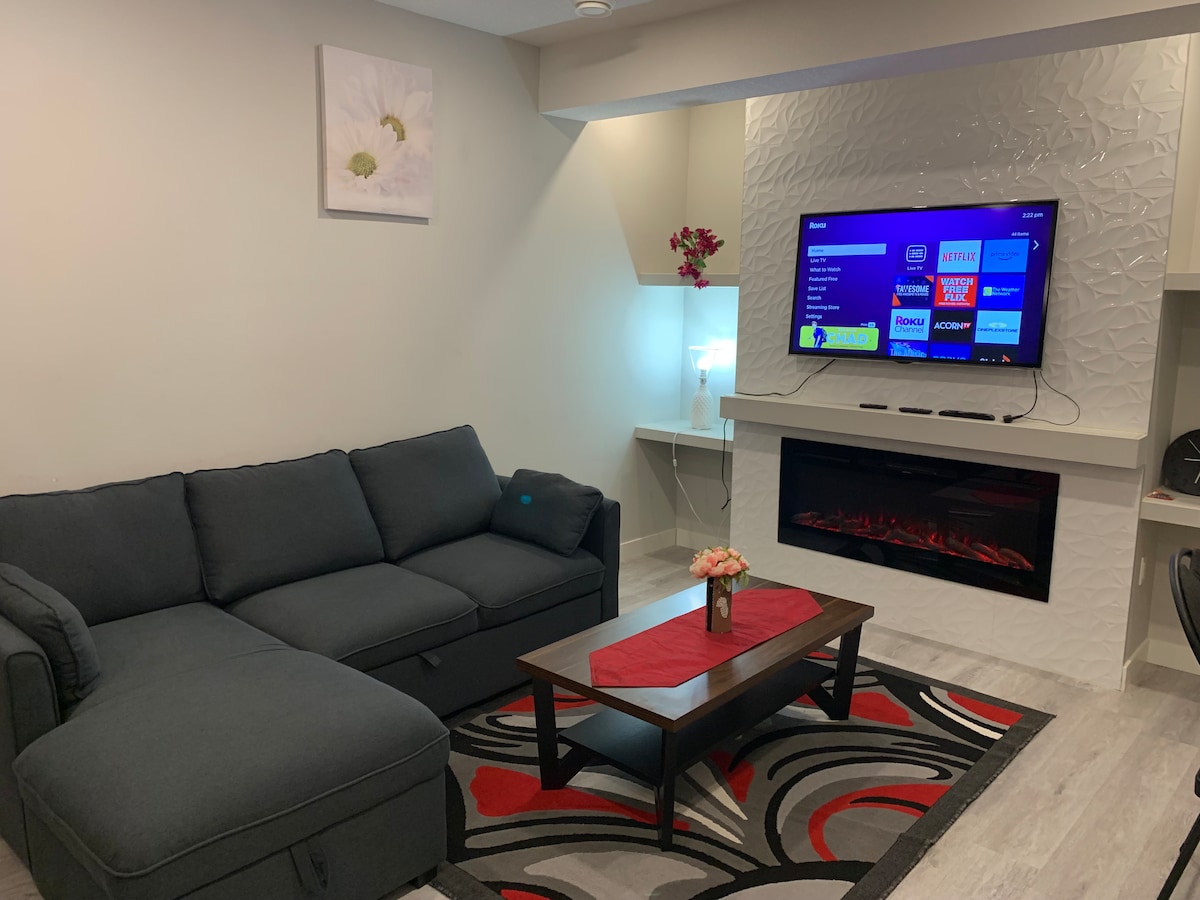 Spacious and serene suite w gas fireplace, House at the circle of the street, a 10 minute walk to peaceful fishing pond and all amenities. Skyline Diamond Baseball park, Kids Hockey arena, Skateboard park, outdoor skating rink, and Curling Club, all 7 minutes walk. Sobeys grocery store 10 minute walk away. Firepit in the backyard with gas Barbeque on the back deck for your private use. Cozy FP & in-floor heating w 2 bedrooms, 1 bathroom, kitchenette, dinette, living room with TV live stream.