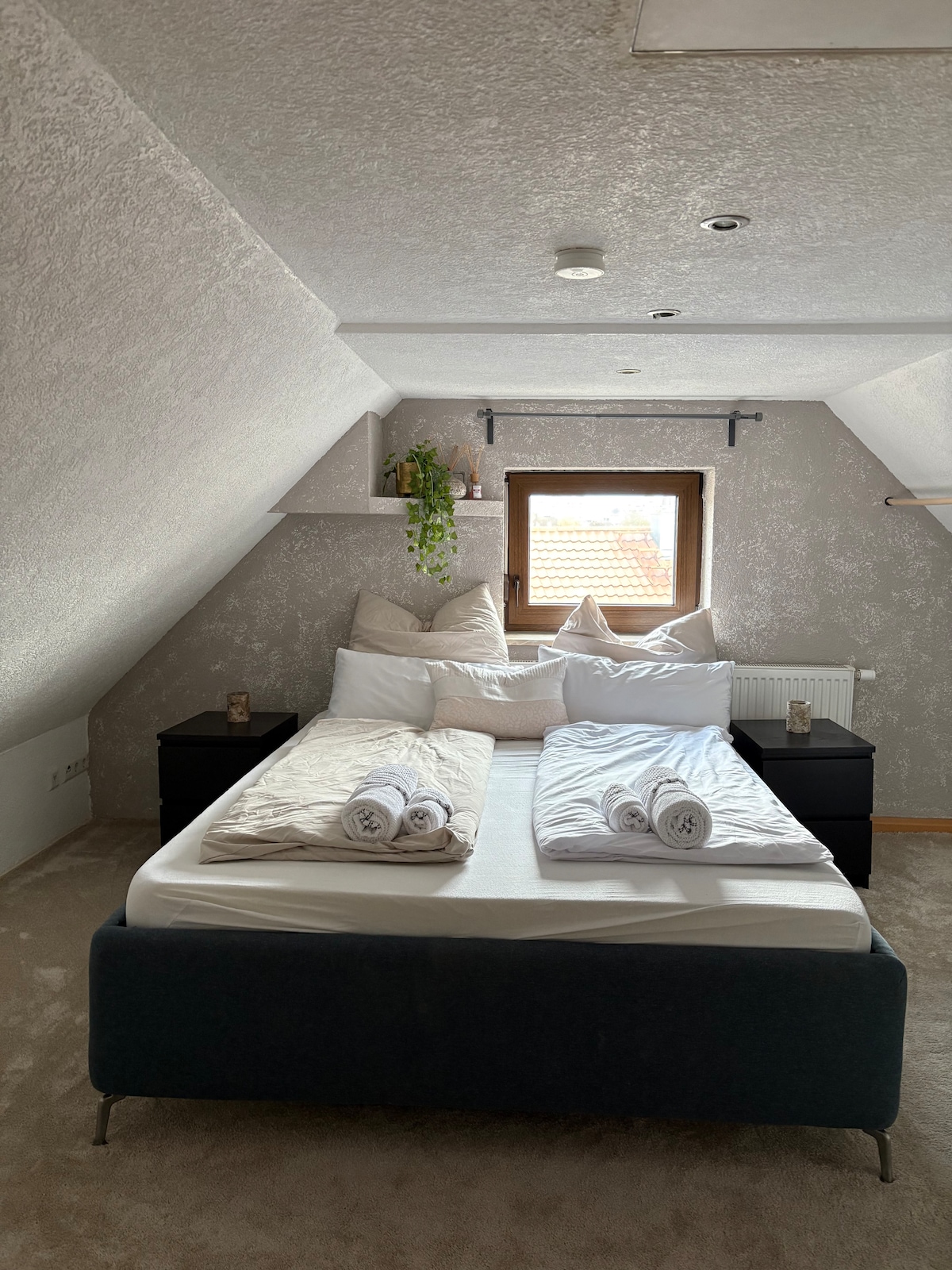 Apartamento luminoso y espacioso de 130 metros cuadrados en una zona residencial tranquila. Calefacción por suelo radiante, persianas eléctricas, espacio para 10 personas. Comedor abierto y sala de estar con amplia cocina (equipada) y balcón. Dormitorio con baño contiguo (ducha, bañera, inodoro). ¡Aseo separado para invitados! Cuarto de ducha en el sótano. Ático tipo loft con 2 sofás cama, 1 silla S, cama doble y estación de trabajo. El centro de la ciudad de Ludwigsburg es fácilmente accesible en coche y autobús en 10 minutos. Se admiten mascotas/niños :)