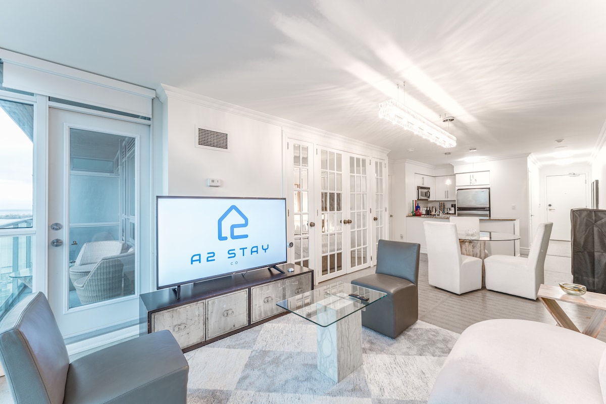 ✦ Disfruta de la vida en un ático en el centro de la ciudad en este elegante apartamento de 2 dormitorios y 2 baños con ventanales de suelo a techo y amplias vistas a la ciudad y al lago. El diseño de concepto abierto cuenta con una cocina de diseño con una isla de mármol, electrodomésticos Bosch y nevera de vino. Relájate en la elegante sala de estar o descansa en los lujosos dormitorios con sábanas de calidad. Disfruta de lavandería en la suite, wifi rápido y baños modernos. Perfecto para profesionales o viajeros que buscan comodidad, estilo y una ubicación inmejorable en Toronto con aparcamiento.