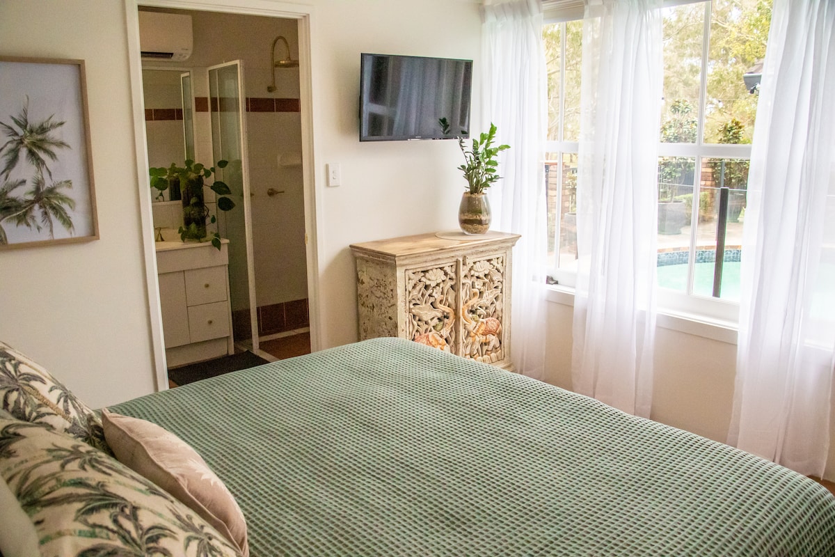 Separado de la casa principal, este encantador estudio con aire acondicionado totalmente independiente es perfecto para parejas. Tiene una cama tamaño queen y un sofá doble de calidad para una persona adicional. El estudio es totalmente independiente y tiene acceso directo a la piscina. Decorado con buen gusto, tiene todas las comodidades de un hogar y una sensación de flujo abierto que permite mucha luz y aire fresco. A 5 minutos a pie de cafeterías, restaurantes y licorerías y a solo 10 minutos a pie del corazón de los restaurantes, club de surf, cafeterías y bares de Palm Beach.