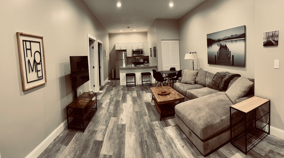Disfruta de tu estancia en este apartamento recién remodelado en un edificio histórico a lo largo del río en el centro de Harrisburg. El aparcamiento está incluido, a pocos pasos de tu entrada privada. Este apartamento de 1 dormitorio y 1,5 baños cuenta con muebles elegantes, una cocina gourmet con electrodomésticos Samsung y una barra de comedor de mármol, TV inteligente, espacio de trabajo dedicado, medio baño, baño completo privado completamente revestido de azulejos y lavadora y secadora en la unidad. Encanto histórico con todas las comodidades modernas, ¡a pocos pasos de todo el centro de la ciudad!