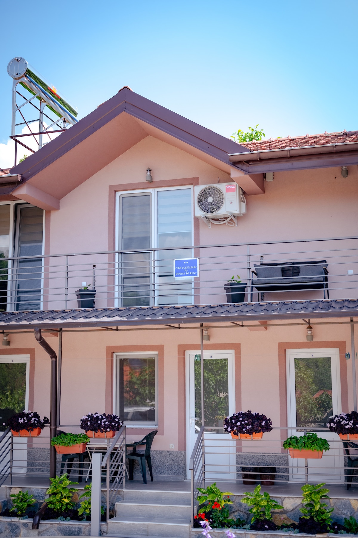 Located at the highest point of Pestani (Ohrid), the yours suite (second floor) offers a unique view of Lake Ohrid and mountain Galicica. Surrounded by greenery and an abundance of nature, you can enjoy on one of the 5 terraces overlooking the lake or the mountain, or simply sit in the garden by the fountain and listen to the sound of the river. In your de luxe suite you have 2 bedrooms, 1 living room, a full equipment kitchen, bathroom, toilet, closed terrace with fire p and huge green garden.
