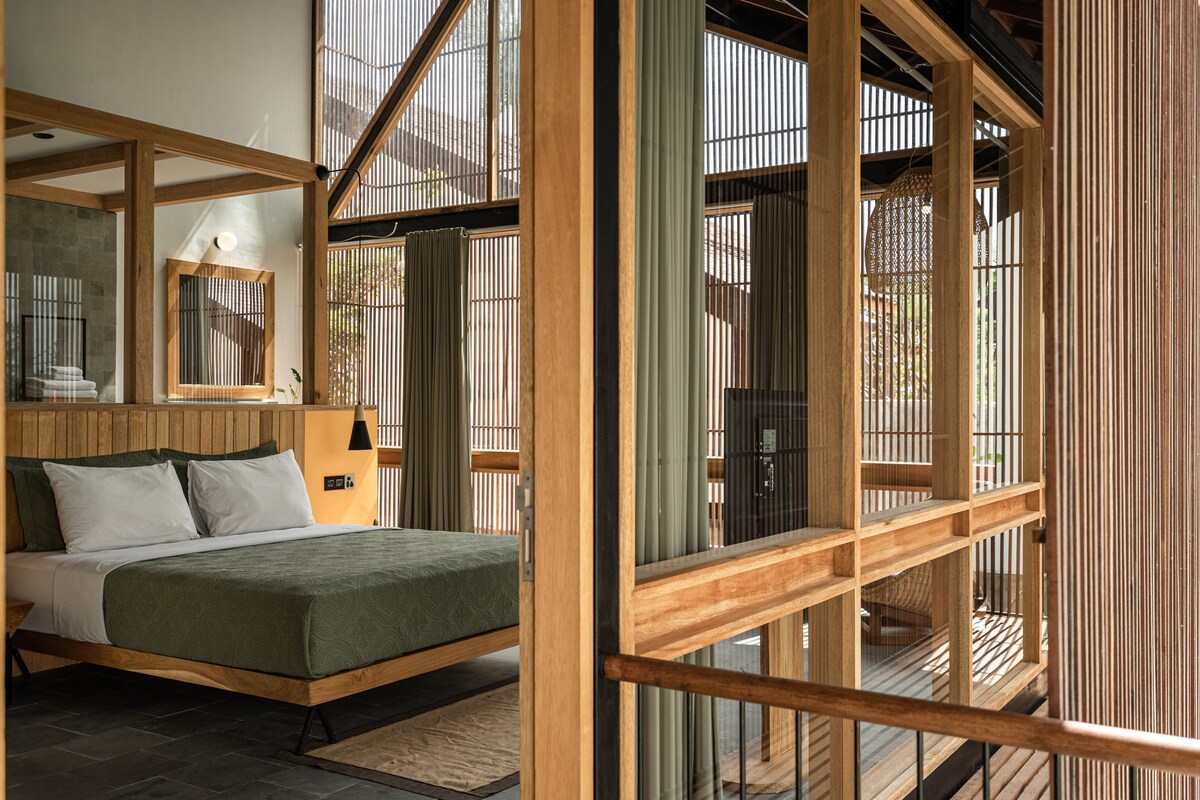 Escápate a un elegante loft en una entreplanta en Tabanan con una bañera de hidromasaje con vistas al bosque, perfecto para relajarte o trabajar a distancia. Este espacio minimalista cuenta con una cocina totalmente equipada, wifi rápido y detalles de diseño moderno. Ubicado a pocos minutos de la playa de arena negra, el vibrante mercado local y las impresionantes puestas de sol, es un refugio ideal para nómadas digitales o parejas que buscan descubrir la verdadera Bali, virgen, lejos de las multitudes turísticas.