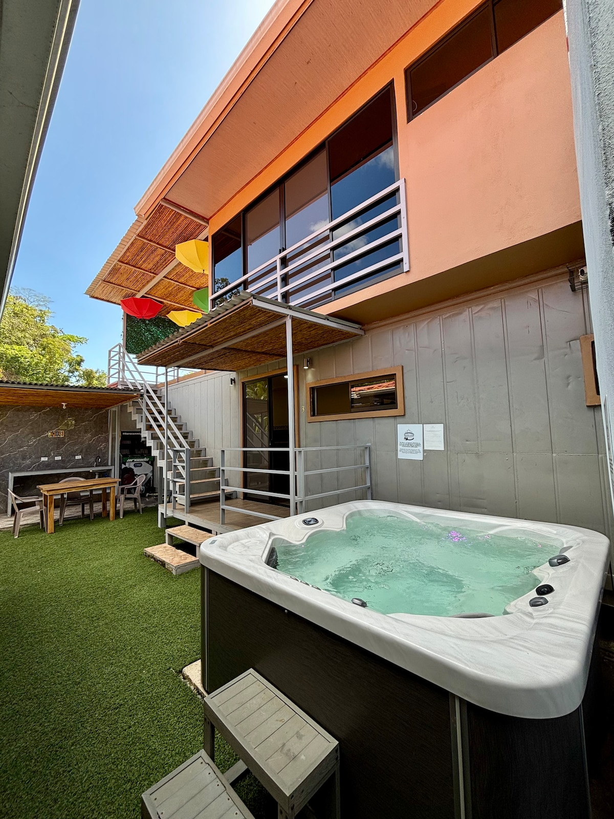 Disfruta de tu cómodo apartamento en el primer piso rodeado de la belleza y los sonidos de la jungla. Cada apartamento está equipado con balcón privado, AC, baño privado con agua caliente, kitchenette , barra de desayuno, acceso al salón compartido en la azotea y cocina al aire libre, Internet de alta velocidad y Smart TV con Netflix. Ofrecemos bicicletas gratuitas para cada unidad para acceder fácilmente a todas las atracciones locales. Nuestra propiedad está a 800 metros de la calle principal.