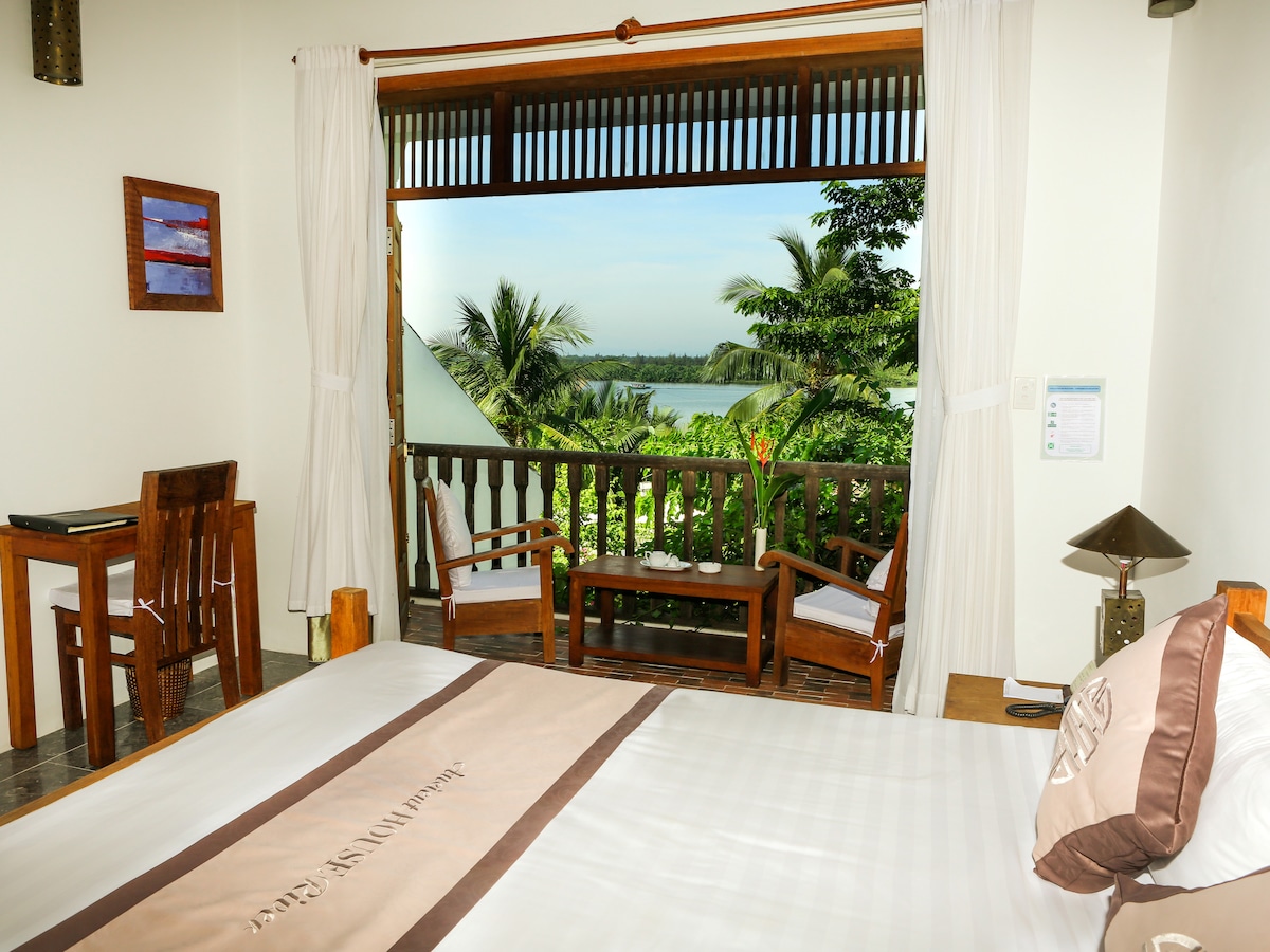 Căn Hộ Gỗ Bên Sông Ngôi nhà gỗ tầng 2 của gia đình tôi, nhìn ra sông và rừng tre xanh mướt. Không gian thư giãn tuyệt đối với nội thất nhẹ nhàng, đơn giản. Chúng tôi yêu thích bản hòa tấu êm ả từ thiên nhiên: tiếng chim hót sát cửa sổ, tiếng tre cót két, gió xào xạc. Căn hộ có đủ bếp nhỏ, bàn ăn, chỗ quây quần. Nơi lý tưởng để lắng lòng lại, tìm về sự đơn giản và tự nhiên, giúp tâm hồn rộng mở.