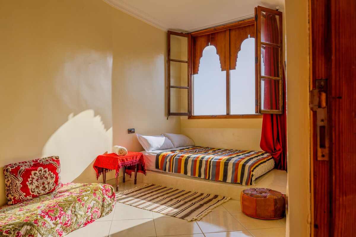 Have a unique beautiful orientalist room with a view to the Kasbah entry door, private and safe. With free wifi connection and the use of a magnificent bathroom. Feel like in a friends house having your independency and be single not feeling lonely.