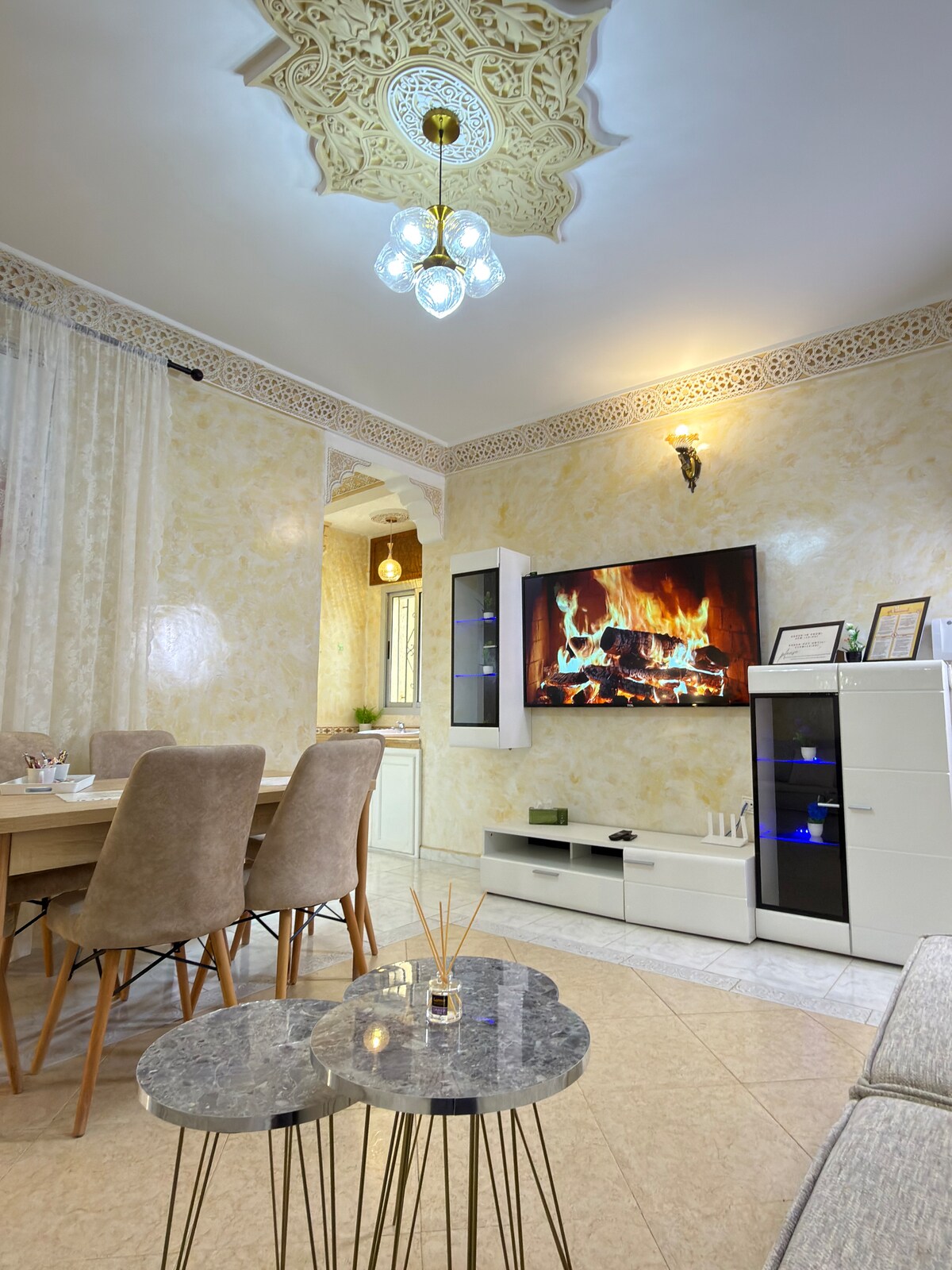 This charming luxury apartment is located in the heart of Tangier’s Mesnana Golf area Enjoy fast Wi-Fi, free parking, and handcrafted Moroccan decor that adds a warm, and giving the space a soulful Moroccan touch,Just 5 minutes from the beach, forest, and surrounded by cafés, luxury restaurants, and supermarkets. Located on a main road with easy transport access This apartment is ideal for couples, families, or anyone looking to explore Tangier while enjoying a peaceful and stylish home base.