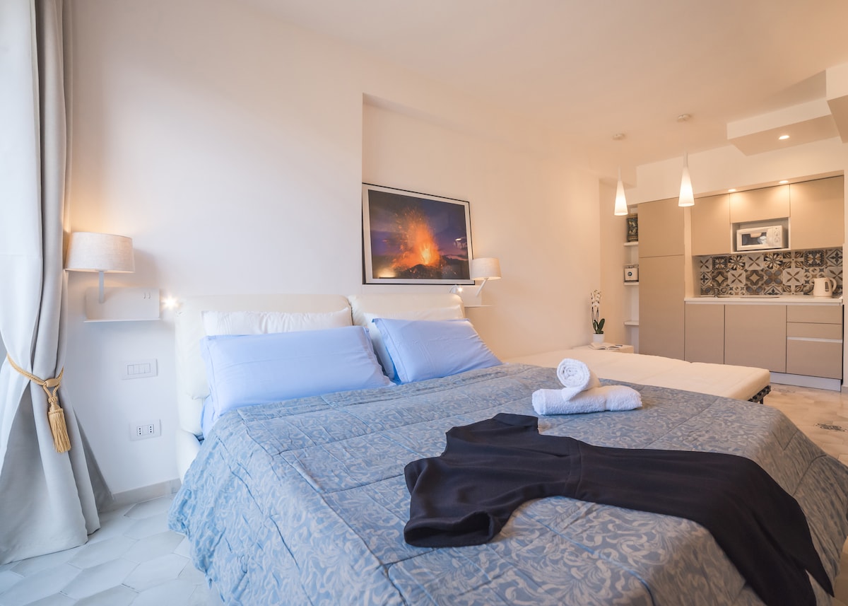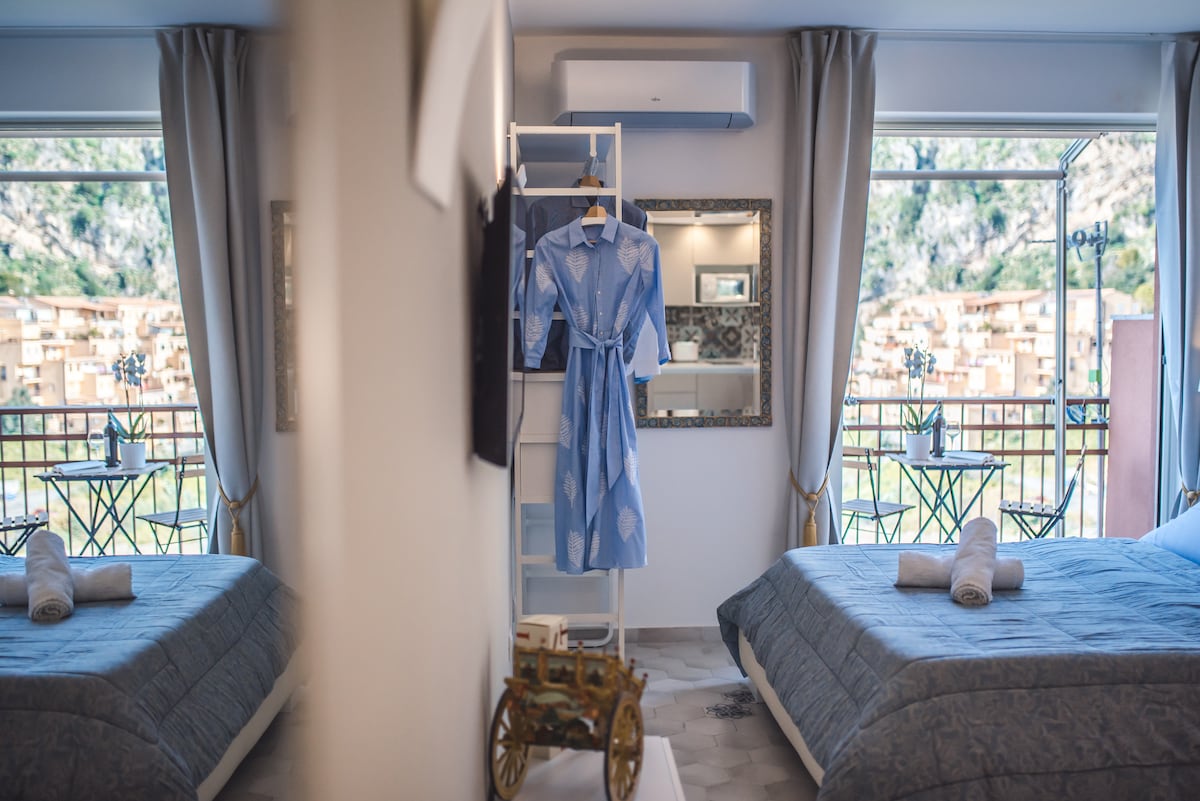 Appartamento di 70 mq interni e 20 mq di terrazza panoramica vista mare, lussuosamente arredato e arricchito di preziose opere d'arte. I quadri d'autore e le manifatture locali come teste di moro e maioliche vi accoglieranno nel cuore della tradizione siciliana,ogni stanza è climatizzata e curata in ogni dettaglio, con SMART TV 75' QLED posta nella sala principale in una splendida cornice con vista mozzafiato. Garage su richiesta, da confermare al momento della prenotazione (€ 15,00 per giorno).