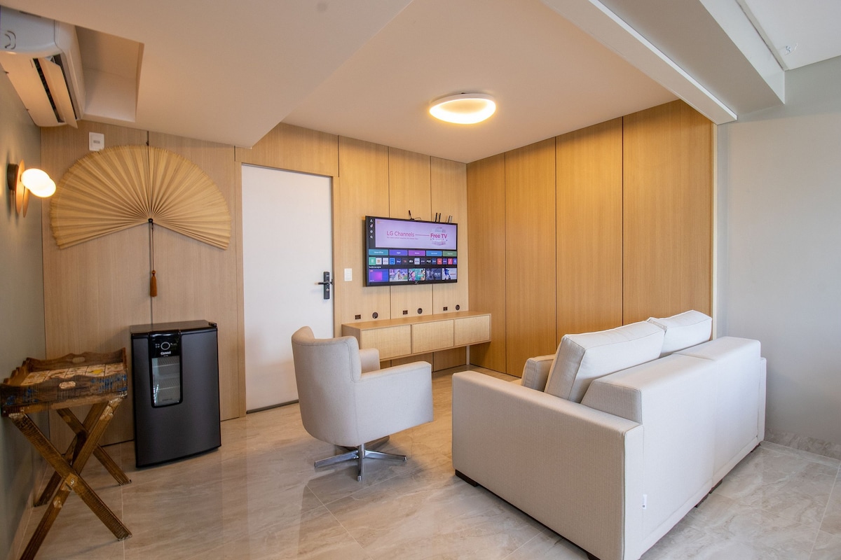 Lounge Apartment, located in Brava Beach and 10 minutes from Balneário Camboriú. The location is perfect. Only 5 blocks from Beach. Close all parties and restaurants. Condo with complete infra, Pool, Gym, Steam and 4 Barbecues. The apartment has Mountain-facing Jacuzzi with hydro and chromotherapy. Ideal for relaxing or take a romantic time. It has 58 'smart TV in the living room and 40' in the bedroom. Full kitchen. Machine washes and dries. You will love this place.