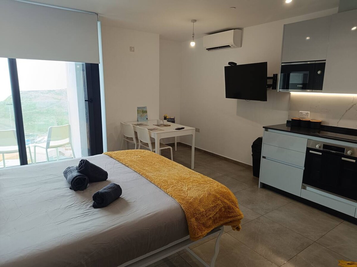 Take a break and unwind at this peaceful oasis - perfect for relaxing and also for working. This studio is about 20 minutes walk from the airport, 20 minites walk to main street and about 15 minutes walk to Ocean village. The nearest beach is a few minutes walk away and other popular beaches further along the east coast. The flat is located on a high floor with great views of the beach and sea. There is a lovely restaurant downstairs and a spa and gym in the basement.