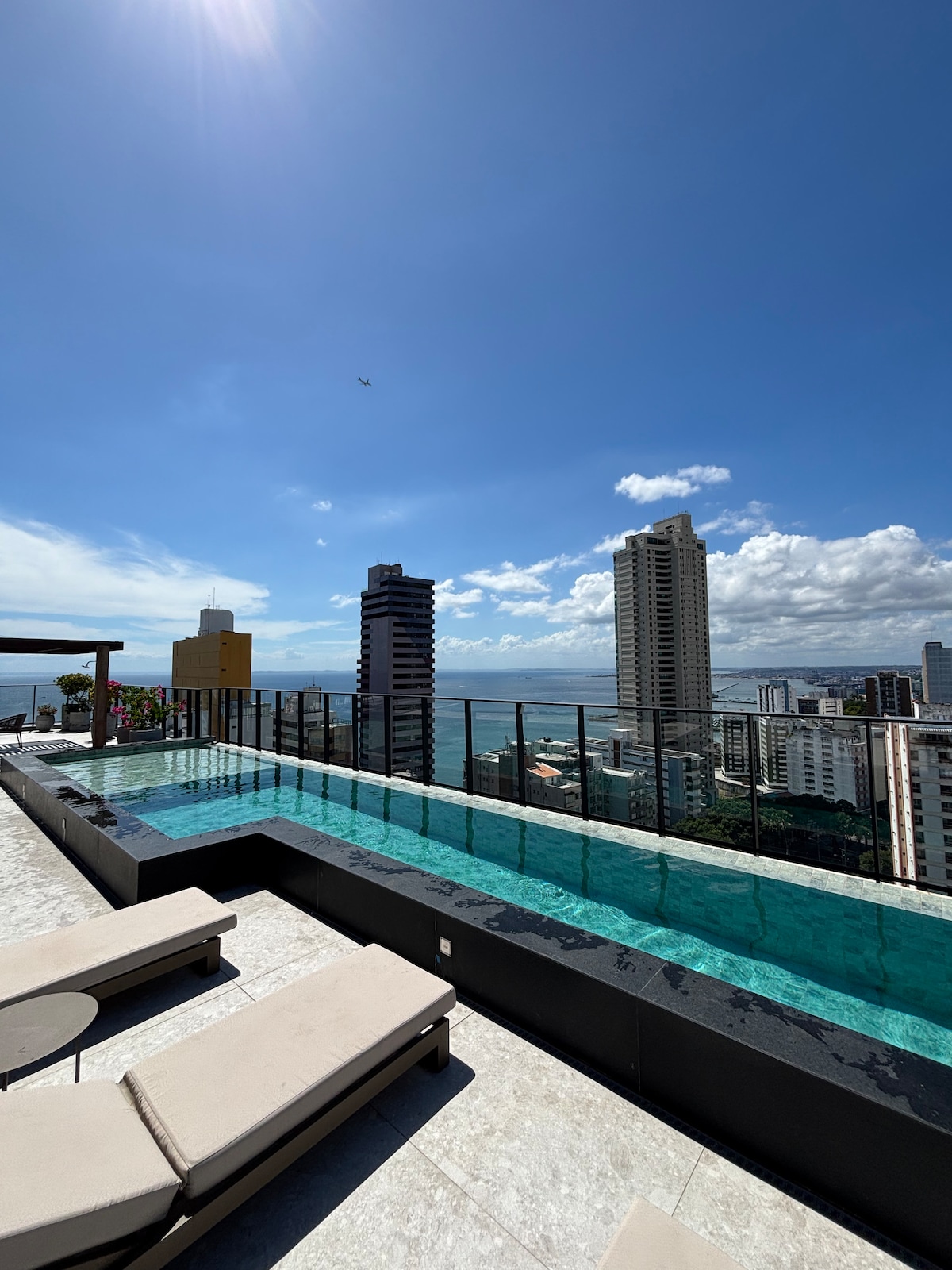 Anfitrião Superhost! Studio boutique no edifício Alive, no bairro Vitória — endereço mais nobre de Salvador. Desfrute piscina com borda infinita e vista incrível para a Baía de Todos os Santos. Moderno e finamente decorado, cama queen confortável, ar-condicionado, Wi-Fi 600 Mbps perfeito para trabalhar ou streaming e estacionamento grátis. A apenas 1,7 km da praia do Porto da Barra, perto de cafés, restaurantes e supermercado a 60m. Conforto, elegância e localização privilegiada em um só lugar.