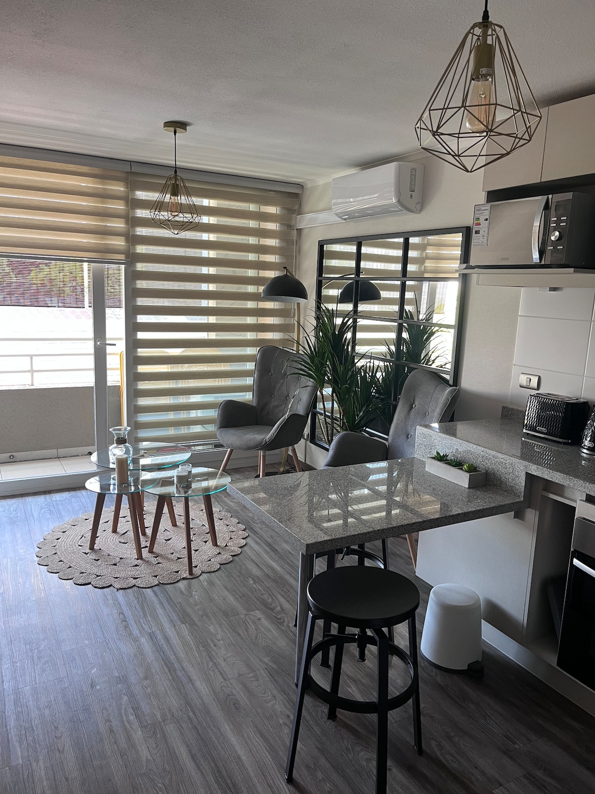 Departamento completo en Santiago Centro, equipado con aire acondicionado (frio/calor) desde septiembre 2025. Seguridad 24/7. A 3 min caminando del metro Parque Almagro y el Teatro Caupolicán. Está a sólo 7 cuadras de la Alameda y Centro Cultural La Moneda. Es el lugar ideal para personas que quieran ir a eventos en el Caupolicán o para hacer turismo en la ciudad. El departamento tiene 2 ambientes, living-cocina y un dormitorio. Adicionalmente tiene una pequeña terraza ideal para fumadores.