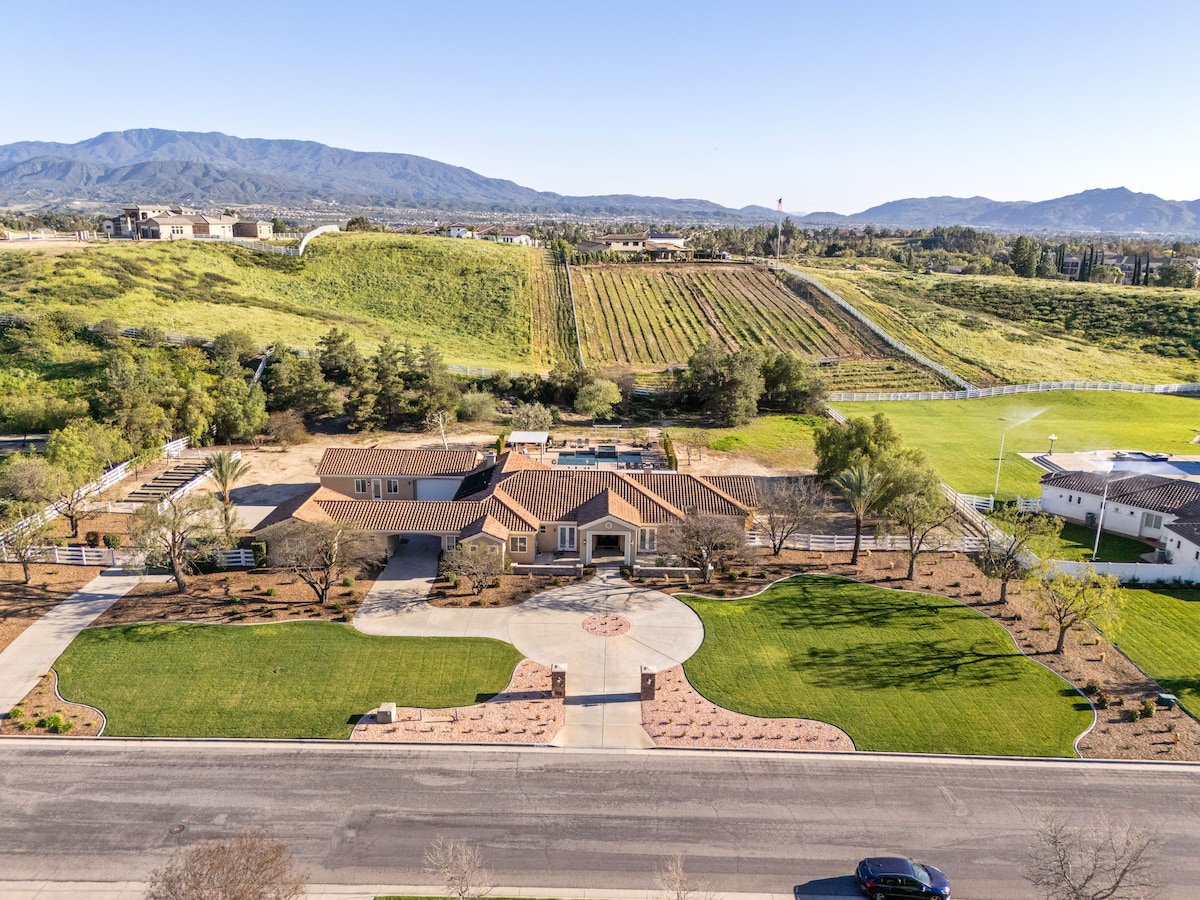 Escápate a la pintoresca región vinícola y disfruta de una vida de lujo en nuestra impresionante casa de vacaciones, a solo minutos de las bodegas de Old-Town y Temecula. Características: Piscina y spa de agua salada: ¡pregunta por la calefacción de la piscina! Mesa de billar, tejo, mesa de póker, ping pong, jenga gigante, corn-hole, Arcade... 4 TV Duchas con efecto lluvia en todos los baños Bañera romana en el baño principal Diseño espacioso para grupos grandes Zona de descanso al aire libre, isla de barbacoa, fogata Espacio de trabajo Crea recuerdos inolvidables en este hermoso entorno