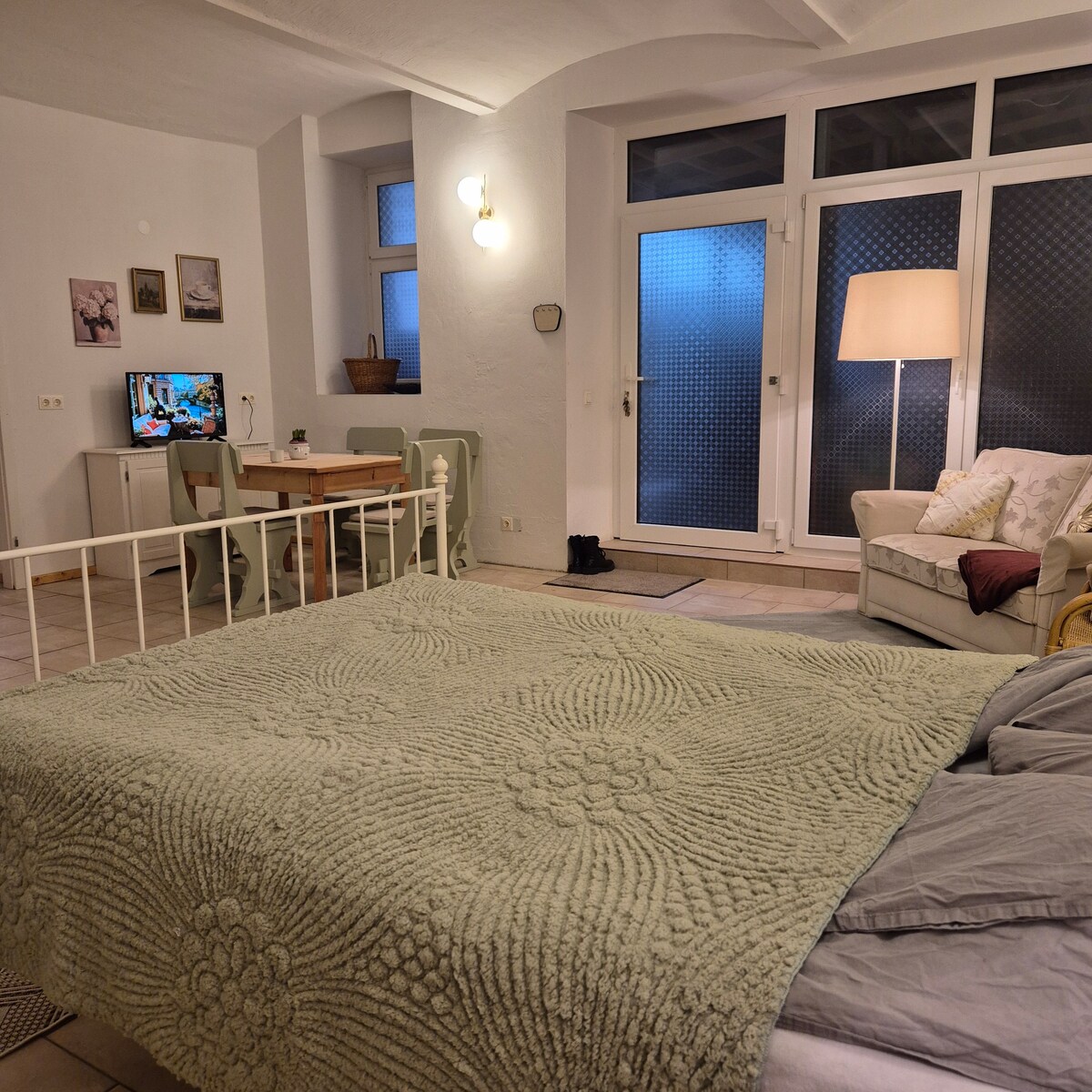 Gemütliches Studio mit Berliner Altbaucharme und modernem Bad inkl. Wellnessdusche und großer Badewanne. Das Studio ist in einem schönen ruhigen Innenhof und dennoch gut gelegen. Für Geschäftsreisende, Paare und auch Familien mit (kleinen) Kindern geeignet; zusätzlich ausziehbares Bett vorhanden und Beistellbett für Babies/Kleinkinder möglich. Die moderne Küchenzeile bietet eine gute Ausstattung zum Kochen leckerer Gerichte. Außerdem sind Geschirrspülmaschine und Waschtrockner vorhanden.