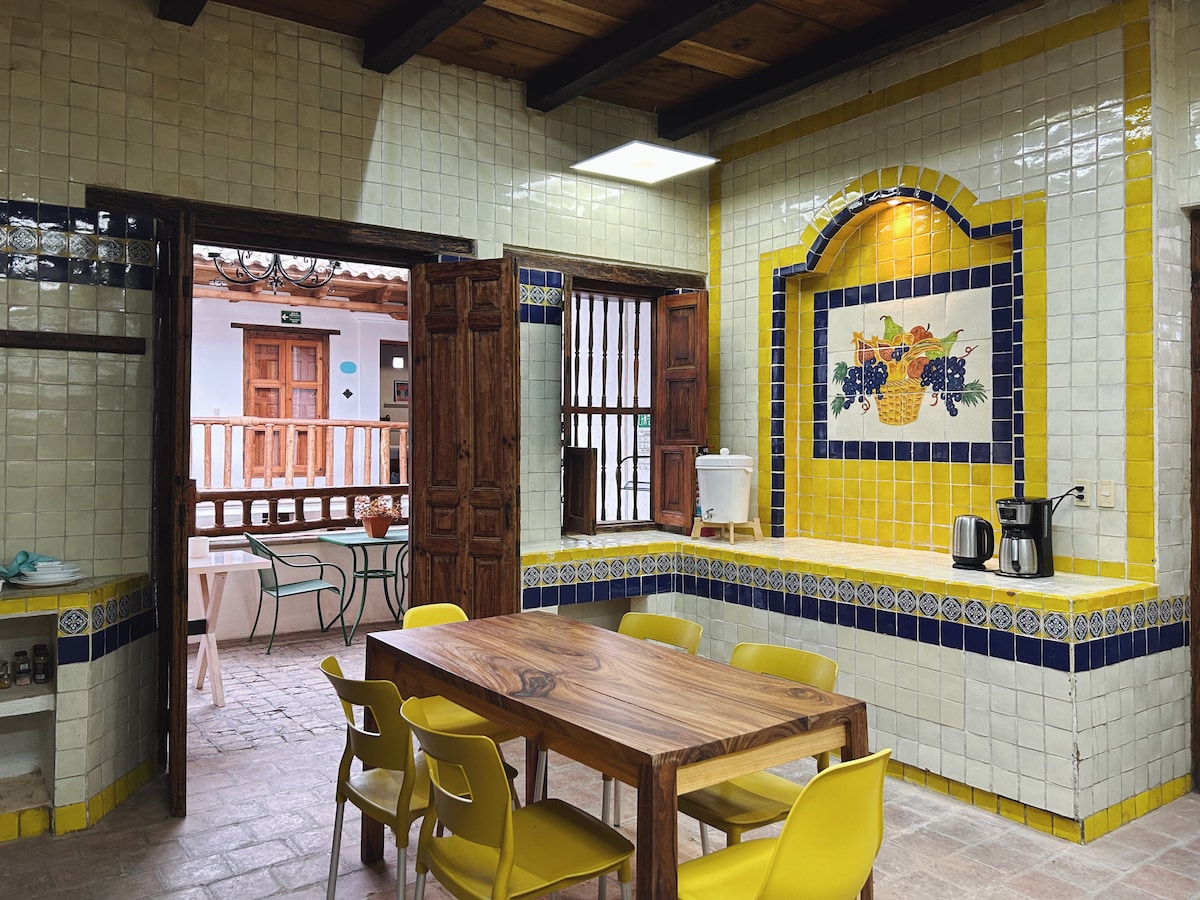Departamento estilo vintage-rústico en una casa de más de 200 años de antigüedad que da a la calle en un lugar excelente a dos cuadras de la Plaza Central. Inmerso en el ambiente de la Ciudad, acondicionado para estar independiente y cómodamente, lo más conveniente de mi espacio es que está en el centro, puede que no sea el lugar ideal si solo quieres escuchar el sonido del campo. Ofrecemos elementos para desayunar como fruta, pan tostado, mermelada, mantequilla, leche y jugo.