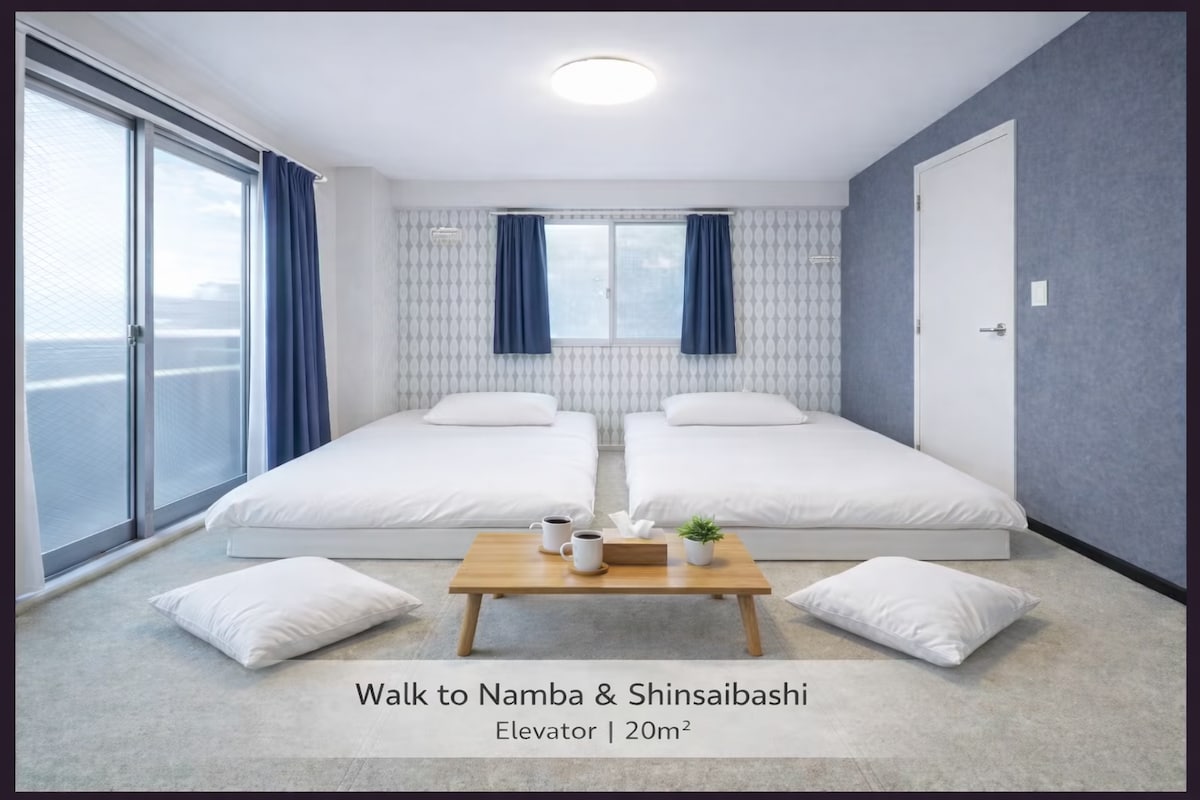 Ofrecemos un espacio de alta calidad a un precio bajo y contamos con el apoyo de muchos clientes habituales. La habitación de 38 metros cuadrados dispone de dos camas. Ideal para amigos y parejas. ¡También es ideal para viajes de negocios! Superficie: 32 m² Cama de 140 cm: 1 Cama de 140 cm: 1 A 5 minutos a pie de la estación de Namba de Nankai y también a poca distancia de Dotonbori. ¡Es la ubicación perfecta para «comerse» el sur de la ciudad, con el Dotonbori de siempre, el Hosenji Yokocho y el actualmente popular Ura-Namba! También es muy fácil llegar a Nara, Kioto y Kobe. ¡El Kyocera Dome, el Osaka-jo Hall, el USJ y otros lugares están bien comunicados! Desde Kansai Airport, hay un autobús de enlace y un tren de Nankai. ¡Sin cambios!