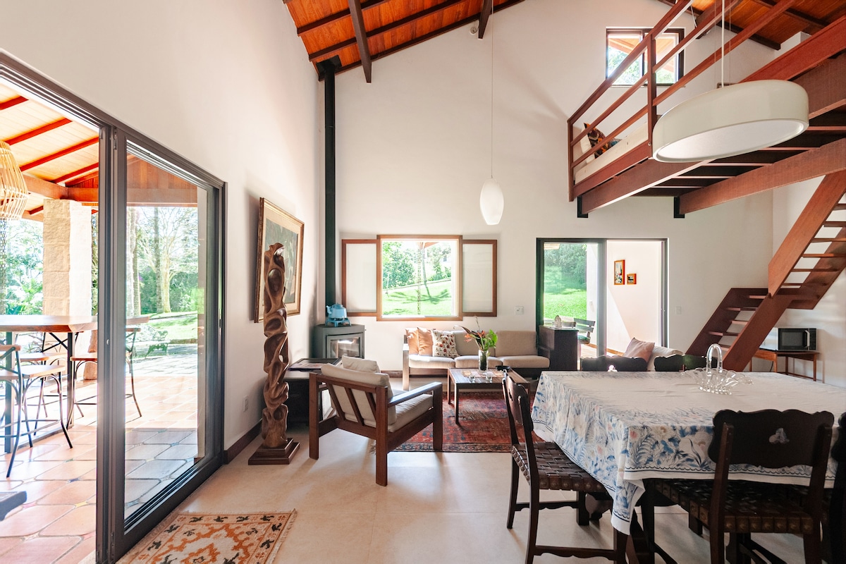 Refúgio charmoso na serra para casais e familias (até 5 hóspedes), em condomínio fechado, portaria 24h, próximo ao centro. Casa aconchegante, com decoração rústica e lazer privativo: jacuzzi com TV, mesa de bilhar e área gourmet com forno a lenha e churrasqueira. O anfitrião é Chef de cozinha e oferece, mediante combinação, fondue de carnes ou jantar à luz de velas 🍷. 🌱 Sustentabilidade com horta orgânica. ⚠️ Área de lazer do condomínio não permitida. Host fala italiano fluente nativo 🇮🇹