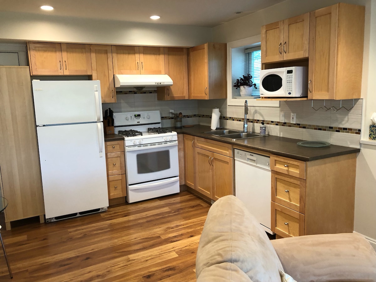 Estudio moderno y luminoso en el sótano con cama tamaño queen y sofá cama. La cocina americana totalmente equipada incluye vitrocerámica, microondas, hervidor de agua, utensilios de cocina y vajilla. Baño privado con ducha a ras de suelo grande y lavadora/secadora en la habitación. Situado en un barrio tranquilo cerca de SFU, de fácil acceso a pie, en transporte público o en coche. A solo 30 minutos del centro de Vancouver en coche o a 45-60 minutos en transporte público. Limpio, cómodo y equipado con todo lo necesario. Nota: Nos encantan las mascotas, pero NO permitimos gatos.