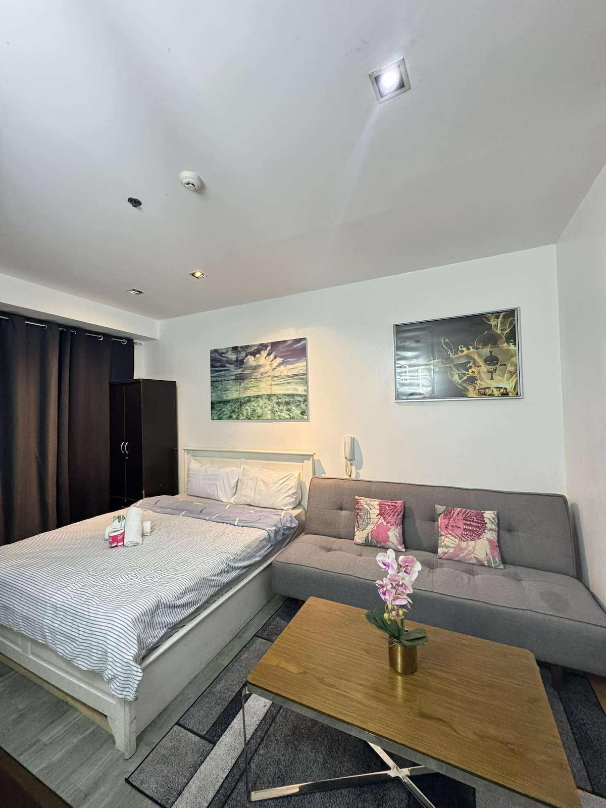 ¡Nueva unidad de estudio de gran tamaño en The Spire! ¡2 camas tamaño queen perfectas para familias y grupos! ¡Tómate el descanso que tanto necesitas en este alojamiento con nuestra enorme Smart TV de 55 pulgadas con Netflix, wifi rápido de 200 Mbps, aire acondicionado frío y lavadora en el alojamiento! ¡El centro comercial Century y el aparcamiento están justo al lado y la zona de entretenimiento de Poblacion está justo a las puertas!
