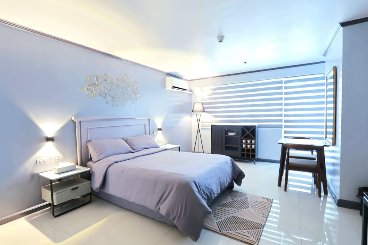 Alojamiento de lujo en Hotel Residences at Acqua Supera el calor del verano y relájate en nuestra hermosa suite en el piso 19 con acceso a la piscina, a través del centro comercial Powerplant, con acceso a restaurantes, tiendas y paseos. A solo unos minutos de la vibrante Población Makati, que es perfecta para ir de fiesta, y a poca distancia de Makati y BGC. Disfruta de vistas panorámicas de los rascacielos de Makati, el horizonte de la ciudad y el río Pasig desde tu suite. Tu refugio elegante y acogedor. ¡Reserva tu estancia inolvidable hoy mismo!