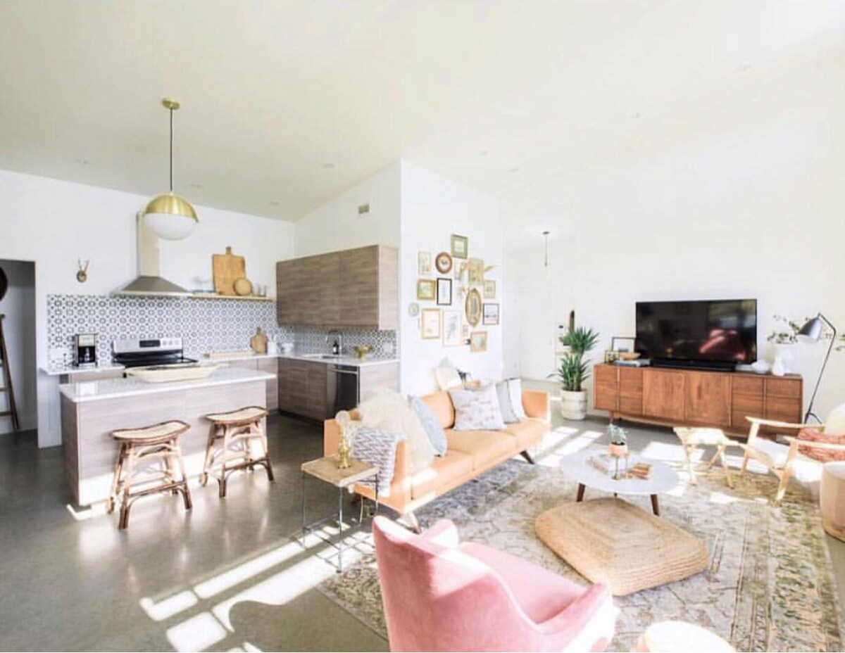 Estudio bohemio moderno | Acogedora estancia y cocina pequeña