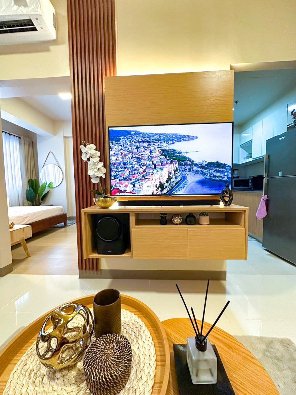 Un apartamento tipo estudio de 25 metros cuadrados en Mactan Cebu. El lugar incluye TV inteligente de 50" con acceso a Netflix, habitación con aire acondicionado, cama tamaño queen con sofá cama, cocina totalmente equipada con nevera, wifi rápido, ducha caliente, juegos de mesa, toallas, acceso a la piscina, gimnasio, cancha de baloncesto, parque infantil y un kit de bienvenida para huéspedes. A poca distancia de Megaworld The Mactan Newtown y LG Garden Walk, iglesias, hospitales, mercados locales, centros de comida, cafeterías y playas.