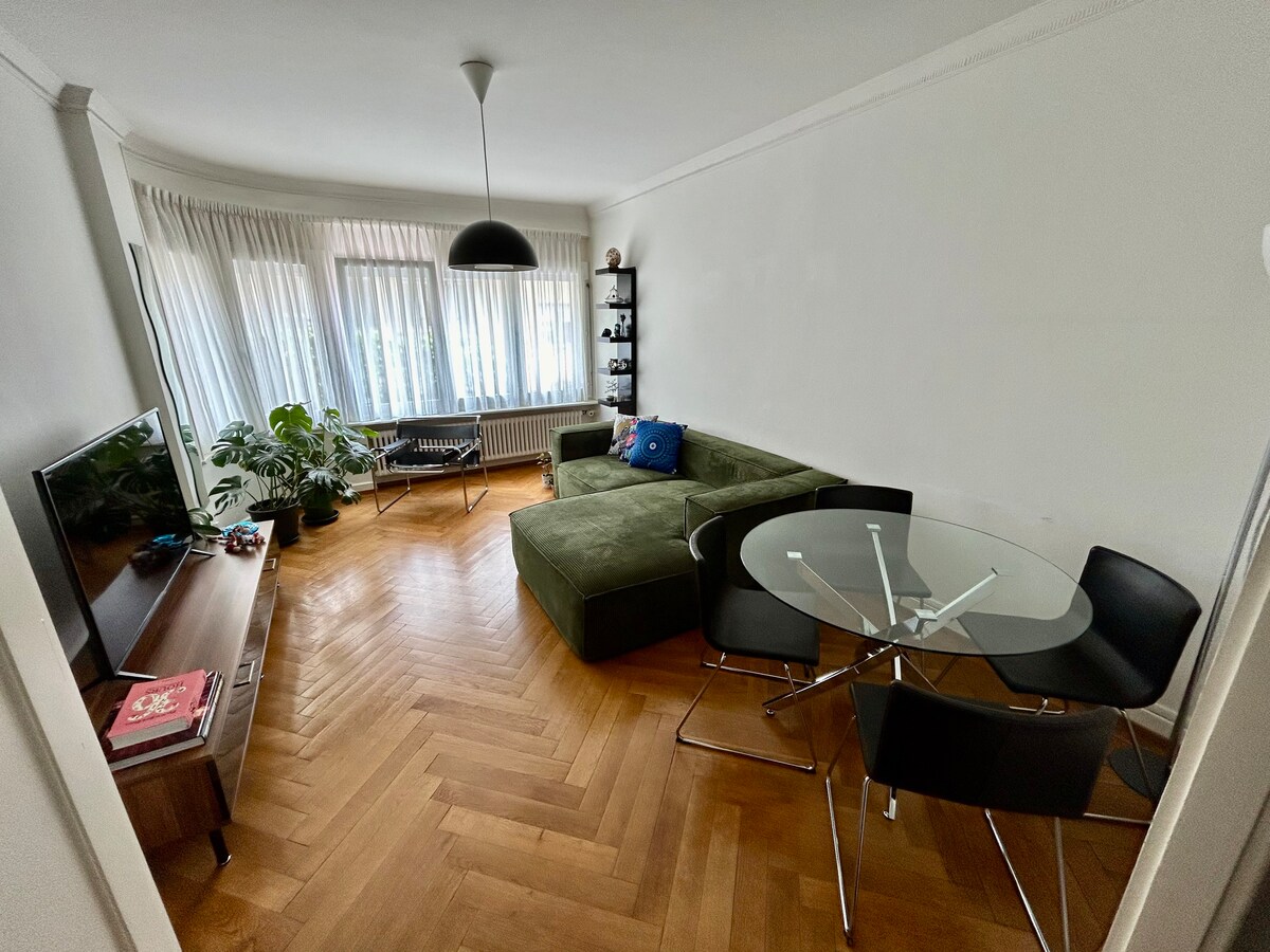 Este apartamento único y lleno de arte se encuentra en un edificio catalogado de 1939 junto al parque Mon Repos, a 2 minutos del metro y del centro. Disfrutarás de 100 m² de espacio privado (5,5 habitaciones en total, 135 m²). Normalmente vivo aquí, pero estaré fuera: tendrás total privacidad. Una habitación permanece cerrada para grupos de menos de 6 personas, a menos que sea necesario. Si necesitas más comodidad en habitaciones separadas (por ejemplo, 2 huéspedes en 2 camas, o 3 en 3), lo abriré por 40 CHF/noche. Todos son bienvenidos, sin importar de dónde sean, en qué crean o a quién amen.