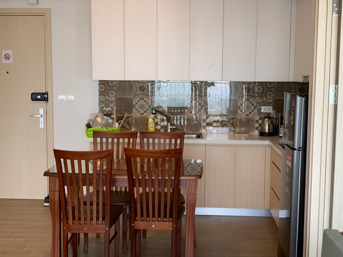 Relájate en este acogedor y lujoso apartamento de Ecopark con baño privado, sauna privada y minibar de cortesía. La cocina incluye freidora de aire, microondas, cocina completa, incluidos utensilios de cocina y sistema de agua filtrada, además de lavadora y secadora. Gimnasio gratuito. La piscina y el onsen son accesibles con tarifas en un entorno verde exuberante. A solo 30 minutos del casco antiguo de Hanoi con servicio de autobús cada hora. Los huéspedes mensuales disfrutan de beneficios adicionales de cortesía para obtener aún más valor.