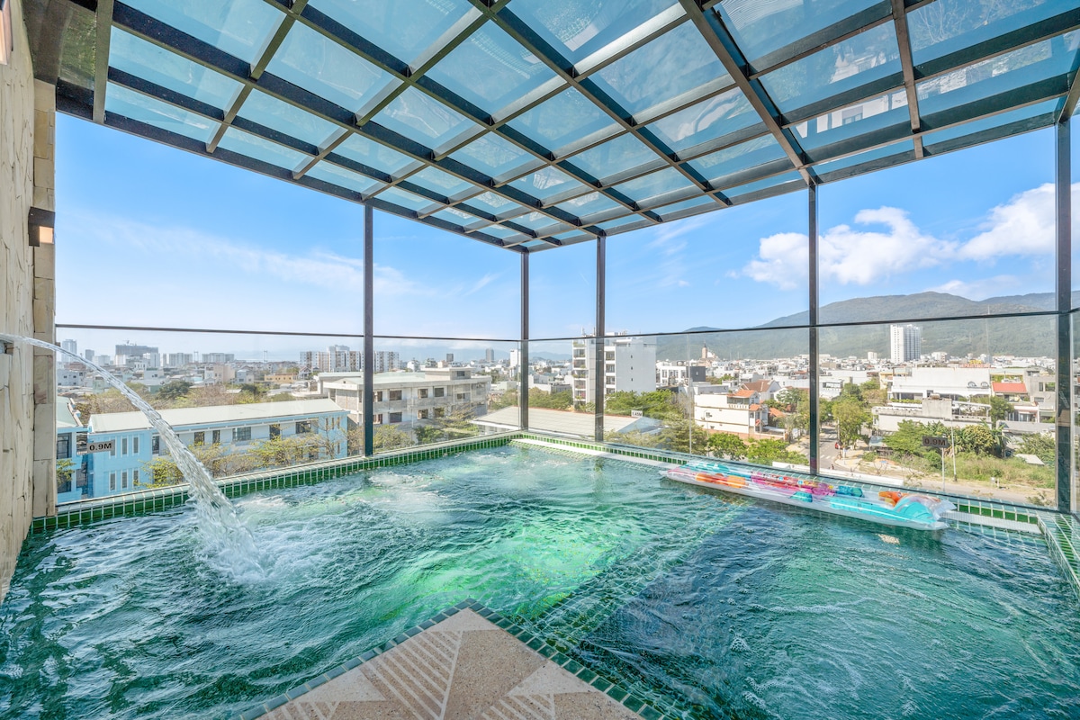 *Sumérgete en la naturaleza del bosque de la montaña Son Tra, el pulmón verde de la ciudad de Da Nang. Una villa que incluye 2 dormitorios y 1 ático con servicios disponibles: * Piscina natural con cascada * Sala de entretenimiento en el ático, espacio para que niños y padres disfruten de las nubes y las montañas, vean dibujos animados con proyector y pantalla disponibles, altavoces Bluetooth para escuchar música. **Sauna de sal del Himalaya **Sillón de masaje relajante, bicicleta estática * Recogida gratuita en el aeropuerto para los huéspedes que se alojen a partir de 3 noches