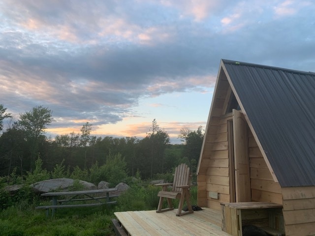 Este sitio fuera de la red, con energía alternativa, se encuentra hacia la parte delantera de una gran finca de doce acres, junto a un arroyo que fluye. Elevada sobre un manantial natural que fluye durante todo el año, la estética de inspiración japonesa de esta pequeña cabaña privada se encuentra encaramada en la parte superior de una cubierta entre los árboles arbolados con vistas al canal que alimenta el manantial mineral, pero no antes de llenar el jacuzzi burbujeante para dos personas, forrado de cedro y calentado con una estufa de leña. Uno de los dos sitios de glamping en los 12 acres.