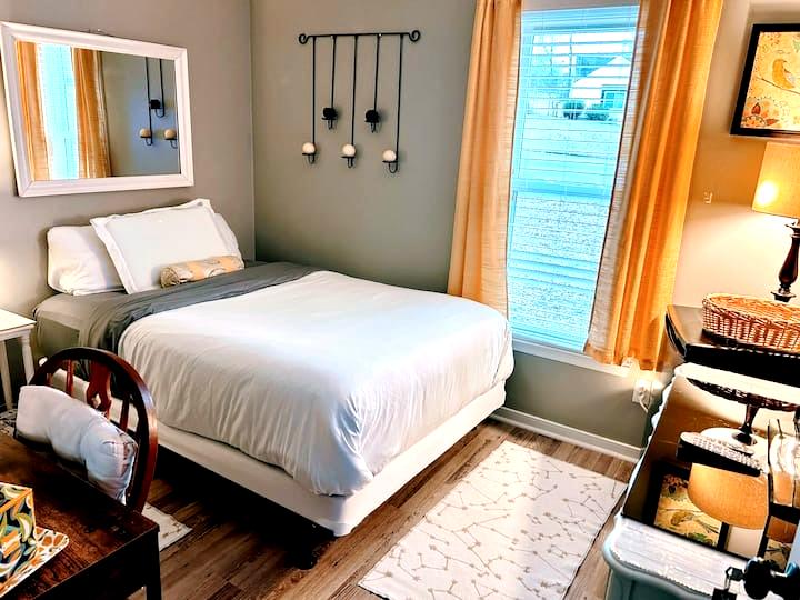 Disfruta de lo mejor de Richmond en esta nueva y encantadora casa de huéspedes privada situada en el centro del extremo oeste cercano. La adición de nueva construcción cuenta con techo abovedado, hermosa pared decorativa de piedra con estantes de madera rústica, sofá de cuero, TV de pantalla grande, encimeras de cuarcita, cocina completa, amplio dormitorio con terraza con vistas a una flor y huerto. Muy accesible a la Universidad de Richmond, VCU, St. Mary 's Hospital y 64 y 95. Willow Lawn Mall a 2 minutos; Short Pump Mall