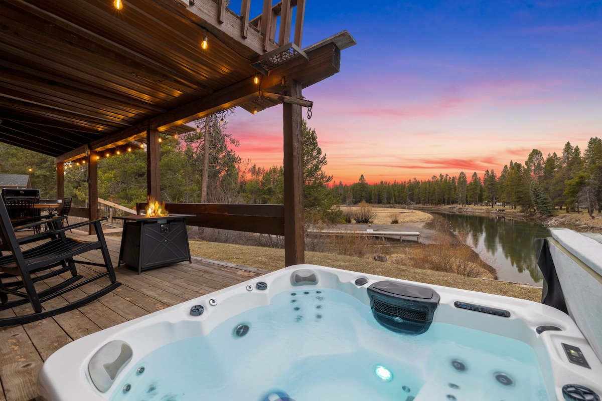 Cabaña de madera frente al río Sunriver con jacuzzi