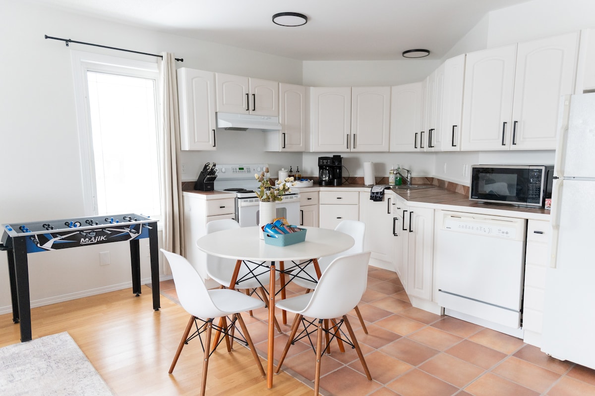 *Welcome to our professionally updated and decorated home 5 minutes from the airport. *Relax with friends and family in the comfortable living room with Roku TV, leather reclining couch and electric fireplace. *Enjoy a meal in the modern kitchen with new appliances, cabinets and granite countertops. *Get a good night’s sleep in one of 4 bedrooms of various sizes, with 4 queen beds and 2 twin beds, 3 desks. 2 piece washroom on the 2nd floor. *Bikes provided for the bike path.