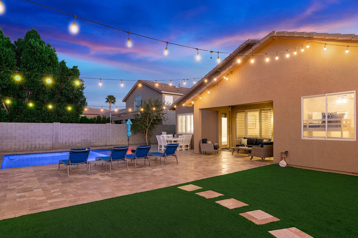 🏊 Year-round relaxation in heated saltwater pool & spa (gentle on skin/eyes) 🔥 Cozy up to fire features 🍳 Fully stocked kitchen + outdoor propane BBQ grill 🎱 Game room with pool table, foosball, darts, & big-screen TV 🌞 Outdoor dining area & bar for enjoying AZ weather 📺 Outdoor TV for games/movies while soaking in the spa 🚗 Easy access to 2 major freeways 🎨 Artfully & uniquely decorated Resort-like escape in Phoenix (Glendale mailing) – perfect for family, golf trips & holidays