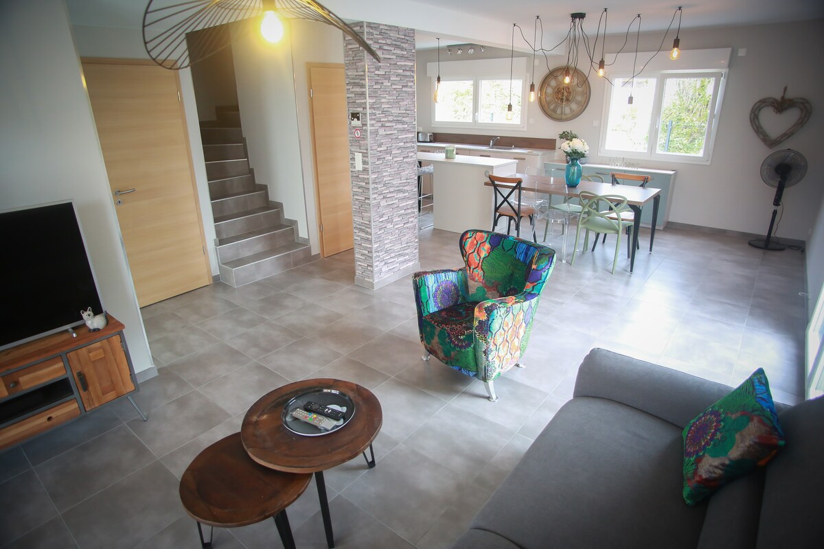 Nuestra casa F2 se encuentra al final del jardín de la propiedad familiar. Es independiente, con una entrada separada y un jardín privado. Como único vecino, otra casa de campo. Mide 50 m², puede alojar de 1 a 4 personas. ¡Animales bienvenidos! Tendrá un dormitorio con 1 cama doble de 1,60 m y un armario, una sala de estar con un sofá cama, una cocina abierta totalmente equipada y un baño con ducha e inodoro. Televisión con pantalla plana y wifi gratuito. Fácil estacionamiento.
