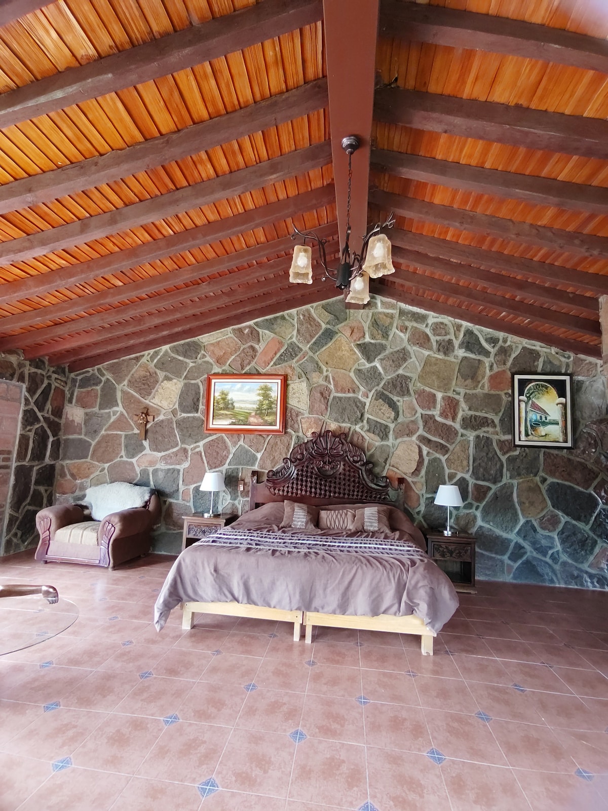 Diviértete con toda la familia en este alojamiento con estilo campirano y moderno a la vez, es un espacio diferente para los que disfrutan los paisajes y la tranquilidad, tiene una terraza que te hará disfrutar tu bebida favorita ya sea al amanecer o atardecer espectacular, tiene un área de 600 metros con un lugar ideal para hacer una fogata familiar y quemar bombones, camas muy cómodas con colchones luna y 3 baños completos. Hasta 12 personas o más.