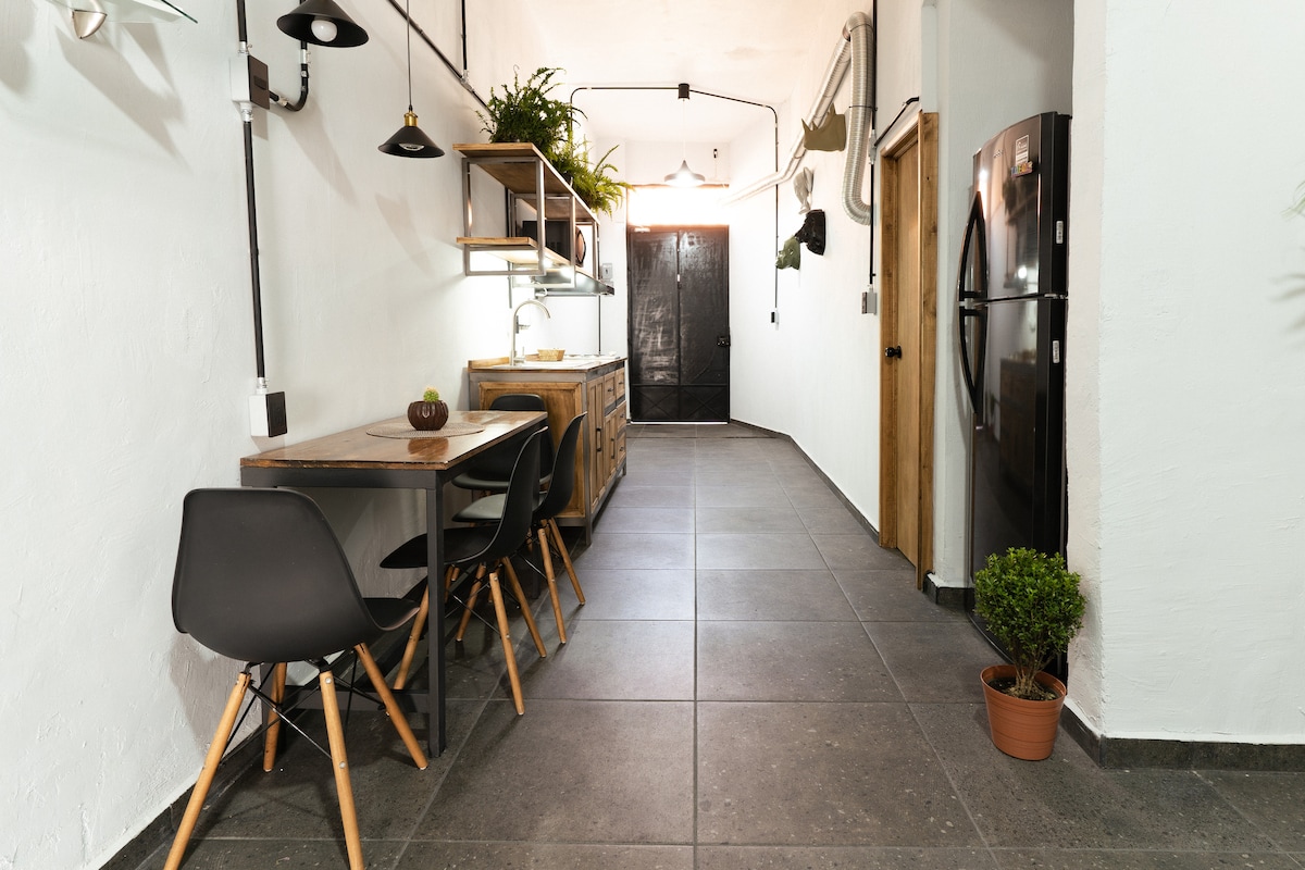 Hermoso y elegante Loft muy cerca del centro de Tlaquepaque donde encontrarás experiencias culinarias, culturales, amenidades y vida nocturna, a unos minutos caminando del tren que conecta toda la ciudad. El Loft cuenta con Aire acondicionado en habitación, área de cocina y sala, cuenta con ducha de lluvia de alta y media presión, cerradura digital, pantalla 4K, internet de alta velocidad 210 Mbps, y sensor CO2. No cuenta con cochera Disfruta de una hospedaje con estilo y elegancia
