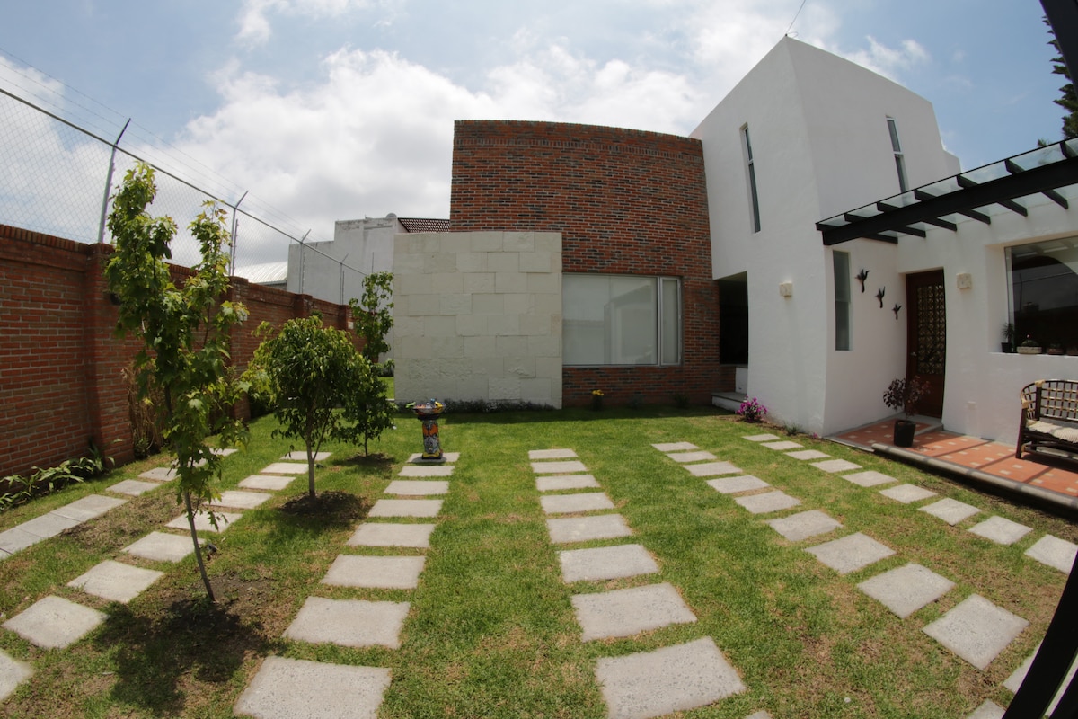 Espaciosa casa con hermosos y diversos rincones. Construida artesanalmente con material extraído de minas y piedra volcánica. La privada es rústica, tranquila, dando una impresión campirana. Perfecto balance entre lo tradicional y el confort moderno. Excelente ubicación; a 7 minutos del pueblo mágico de Cholula, 7 minutos del Humboldt, 5 minutos de la UDLA. Cerca se encuentra "Plaza Explanada" (cine, restaurantes, pista de patinaje). Oxxo/Farmacia a distancia caminable.