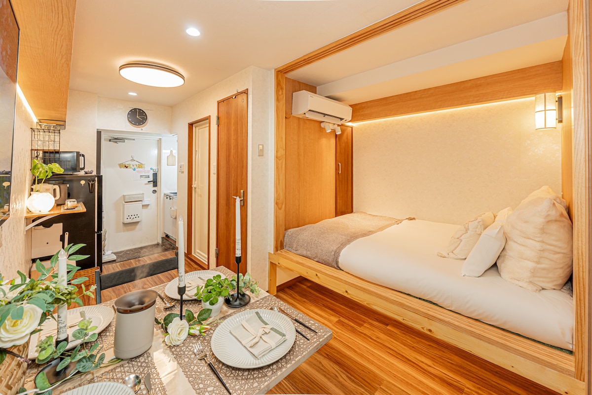 La habitación de invitados se encuentra a 230 metros a pie de la estación de Kitazawa en la línea Keio. 23 metros cuadrados. Está cerca de la estación de tren, así que ten en cuenta la sensibilidad al ruido. La habitación tiene un baño húmedo y seco separado. Hay una cama tamaño king y una litera. Puede que sea un poco estrecho para cuatro personas, pero dos o tres personas están más cómodas. La estación de Kami-Kitazawa está a 13 minutos en tren directo desde Shinjuku. Es conveniente para Shimokitazawa, Kichijoji, Mt. Takao y Sanrio Land.