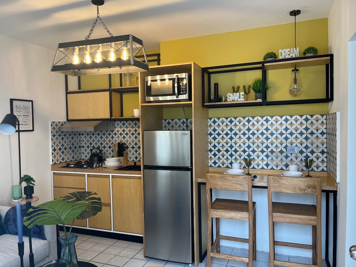 Suite amplia con facil acceso por avenidas principales, ideal para viajes de negocios o de placer, equipada con microondas, frigobar y parrilla electrica; Cuenta con estacionamiento propio.