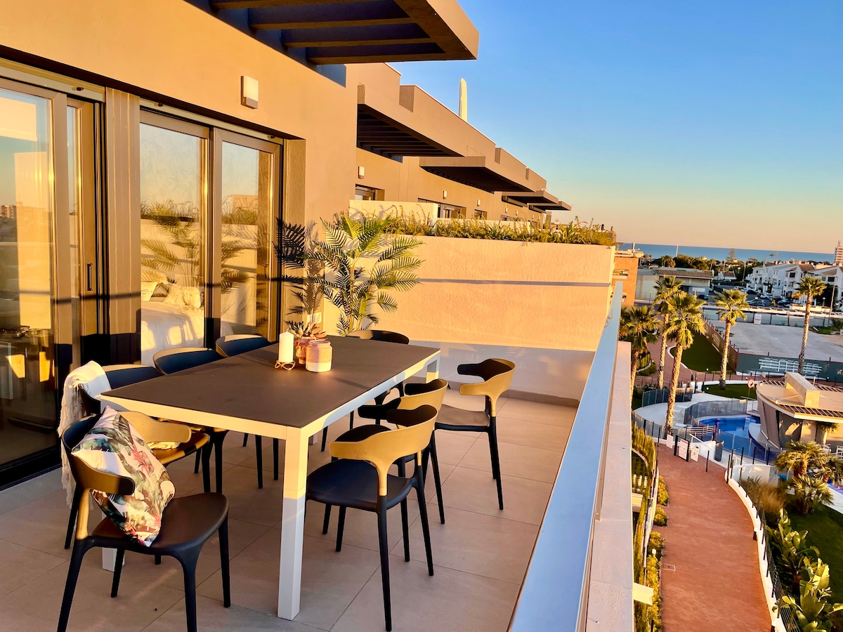 Newly built penthouse with many facilities - Heated pool, bar and snacks bar, jacuzzi, gym, bacery etc. The apartment has two bedrooms and two bathrooms. A large sunny balcony and a private roof terrace. All facilities such as washing machine, dishwasher and aircondition. 6 min to the beach - Flamenca Beach and La Zenia Beach. 5 min to a big shopping mall - La Zenia Boulevard. Supermarket next door and a bakery and restaurant in the building.