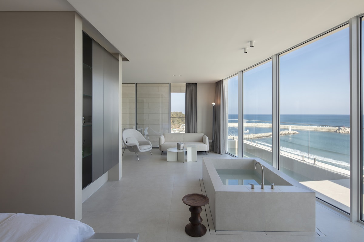 바다 바로 앞에 위치한 오션프론트 프라이빗 풀빌라입니다. 객실 전체가 통유리로 설계되어 침실과 거실 어디에서든 탁 트인 바다 전망을 감상할 수 있습니다. 넓고 미니멀한 공간에는 침실, 거실, 다이닝 공간, 주방이 함께 구성되어 있으며 객실 안에는 바다를 바라보며 즐길 수 있는 프라이빗 스파 욕조가 마련되어 있습니다. 객실에서 보이는 바다는 잔잔한 항구와 모래사장이 어우러진 풍경으로 아침에는 아름다운 일출을 감상할 수 있습니다. 건물 앞 잔디와 데크길을 지나면 바로 모래사장 해변이 있어 조용한 바다 산책과 여유로운 휴식을 즐기기에 좋습니다. 도심에서 벗어나 바다와 자연 속에서 편안하고 특별한 시간을 보내보세요.