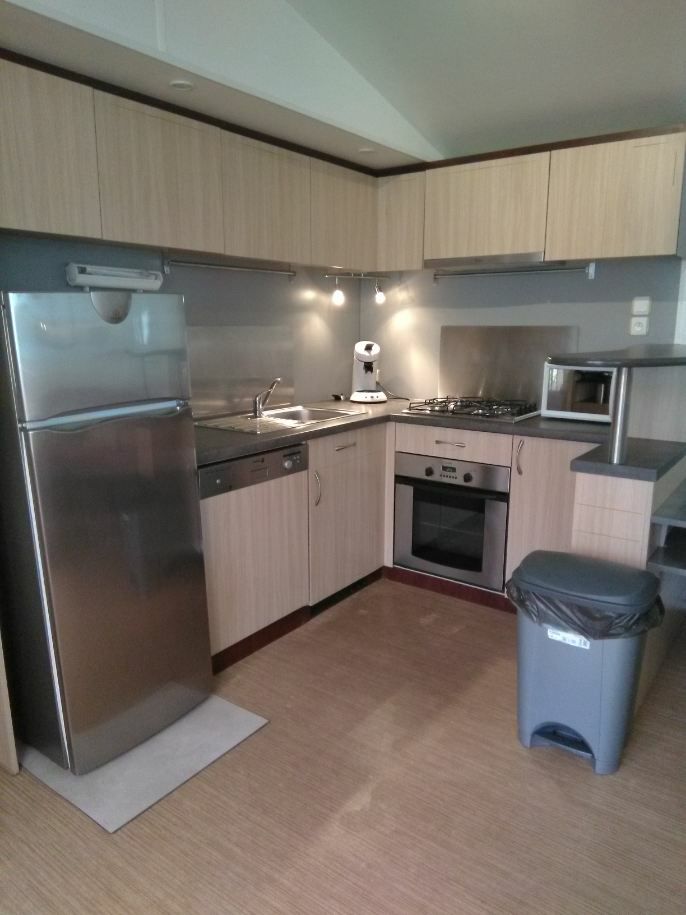 Alquiler Mobile Home de 32 m² con aire acondicionado y una terraza de 32 m² en una parcela de 220 m² en Hyères en el Camping les Pins Maritimes a 200 m de la playa El Mobile Home consta de una sala de estar con un sofá esquinero, TV de pantalla plana, reproductor de DVD, mesa y 4 sillas, una cocina equipada ( gran nevera congelador, microondas, horno, tostadora, cafetera, hervidor de agua), un baño con ducha, inodoro separado, un dormitorio con una cama de 140 y un segundo dormitorio con 2 camas de 80.