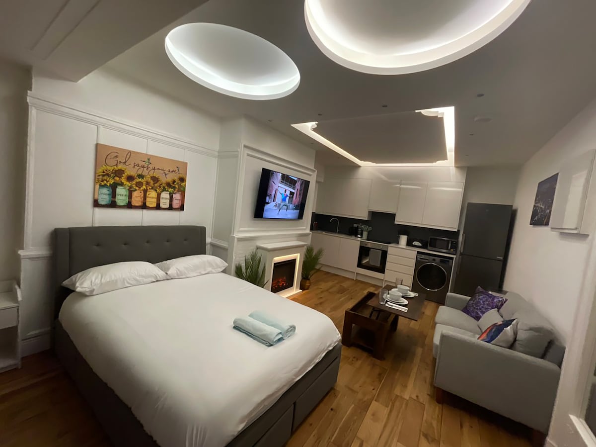 This newly refurbished studio has everything you need for a great stay in London: from free allocated parking directly in front of the property to a spacious bathroom, smart TV, and stylish ceiling lighting. The fully equipped kitchen includes a dishwasher and washing machine. The LED fireplace adds a unique, cosy touch, while the comfortable sofa is ideal for two guests. A dedicated workspace with a desk and office chair is also available.