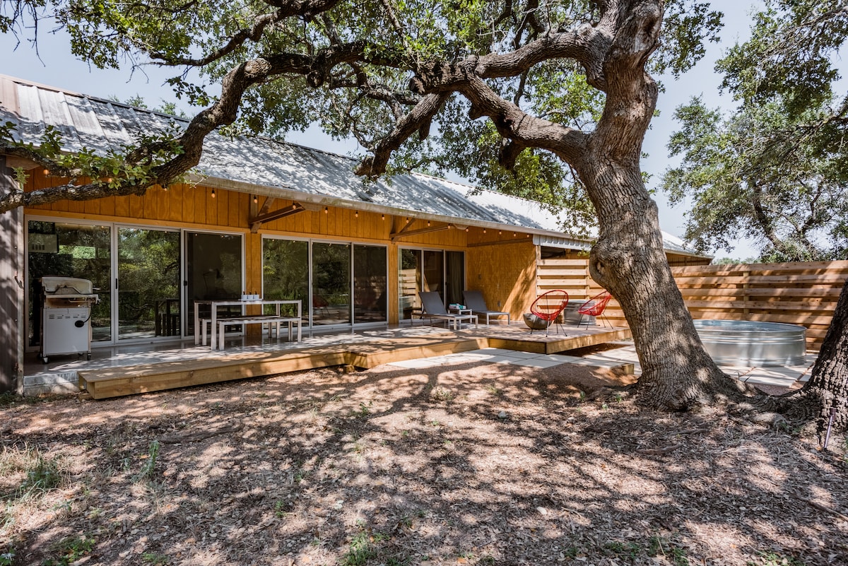 Once a horse stable, we saw the potential for this amazing space to not only host people, but to also inspire them. Named for the two heritage oaks whose branches embrace the space, Twin Oaks features 2 bedrooms with a spacious jack-and-jill-style bath. The living space sparkles, with natural light from wall-to-wall glass sliders bouncing off polished concrete floors. The patio delights, with gorgeous views, firepit and heated stock tank pool for year-round soaking. Welcome to bliss, y’all.