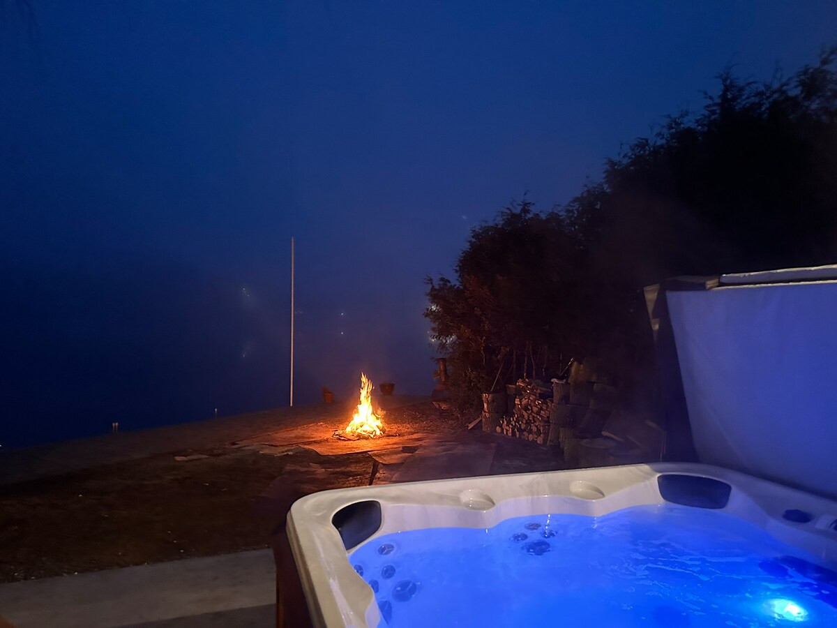 Esta encantadora casa de campo, una de las tres en nuestra tranquila propiedad de 7 acres, ofrece 400 pies cuadrados de comodidad acogedora y más de 600 pies cuadrados de terraza escalonada que conduce a una fogata diseñada profesionalmente. Recientemente renovado con un diseño luminoso y moderno, está lleno de luz natural y estilo. Disfruta de tu propia zona exterior grande y privada diseñada para un aislamiento total. El jacuzzi íntimo es perfecto para dos, y proporcionamos mucha leña para que puedas relajarte con noches cálidas e inolvidables junto al fuego.