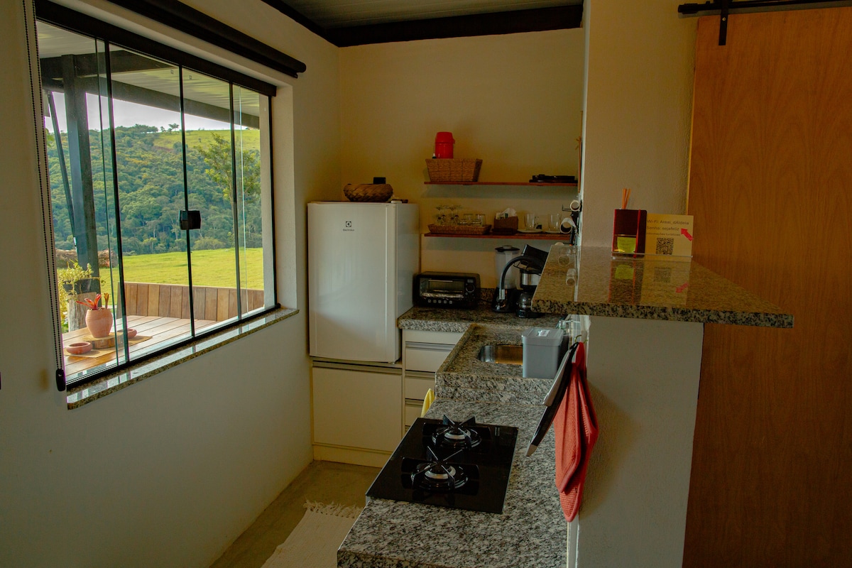 Suíte 1 com 30m2. Vista para as montanhas. Composta de cama de casal e 2 de solteiro (bicama), tv tela plana 42', ar condicionado, frigobar, mesa, ventilador. Banheiro com chuveiro a gás, o aquecedor fica na parte externa da unidade. Suíte 2 com 20m2. Vista frontal para o jardim da residência. Composta de cama de casal, ar condicionado, frigobar, tv 32', chuveiro eletrico. A área gourmet, bem como a piscina serão utilizadas apenas pela família que estiver hospedada. Não oferecemos toalhas banho