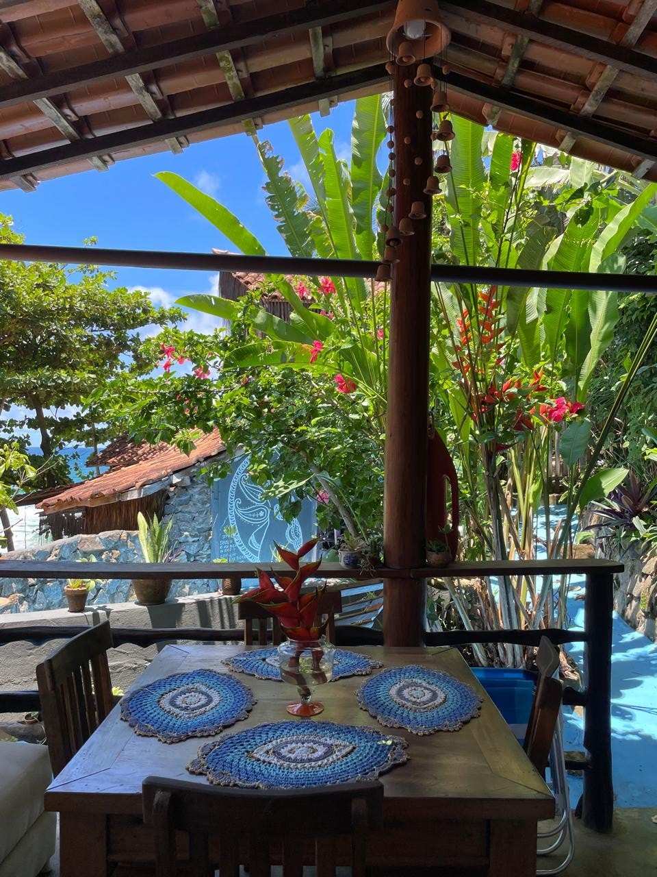 Um refúgio banhado pelo sol, com varanda aberta e vista para o mar. Acorde com o som dos pássaros, tome café com a brisa entrando pela porta e sinta que o tempo parou. Venha viver dias leves. Flat no andar térreo, na Mata Atlântica com uma linda vista para o mar e o Rio de Contas, um refúgio bem próximo do centro de Itacaré.