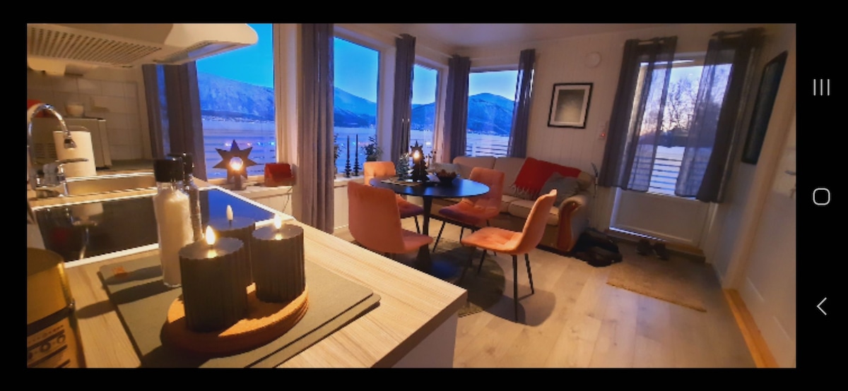 Leiligheten ligger helt nede i strandkanten ved havet, 10 kilometer fra Lagnes flyplass, og 15 kilometer fra Tromsø sentrum. Her er det kort vei til både fjell og elv, så det er riktig og si at du er midt i nord-norsk natur. The apartment is located near by at the sea, 10 kilometers from Lagnes Airport and 15 kilometers from Tromsø city center. It is short distance to both mountains and river, so it's right to say that you are in the middle of northern Norwegian nature.