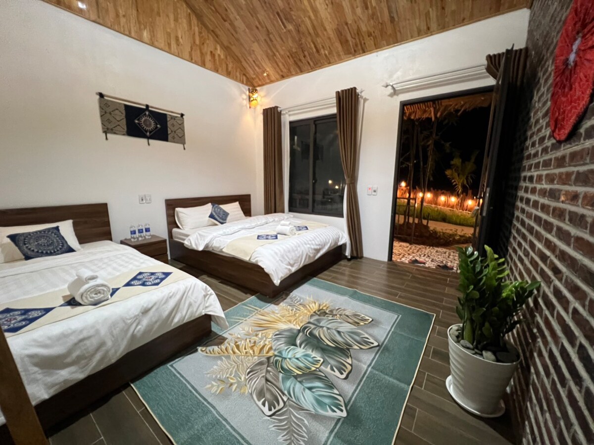 La habitación de madera se encuentra en el lado izquierdo de la casa familiar de la Sra. Tien, que ofrece privacidad y proximidad a la familia anfitriona. La habitación está diseñada con materiales de madera y un techo tradicional de hoja de palma, con una cama en el primer piso y una cama loft, adecuada para una pequeña familia de cuatro o una pareja. Fuera de la habitación hay un espacioso patio frente al jardín con una pequeña mesa de té, que proporciona un espacio tranquilo para que toda la familia disfrute del aire de la mañana y la luz del sol.
